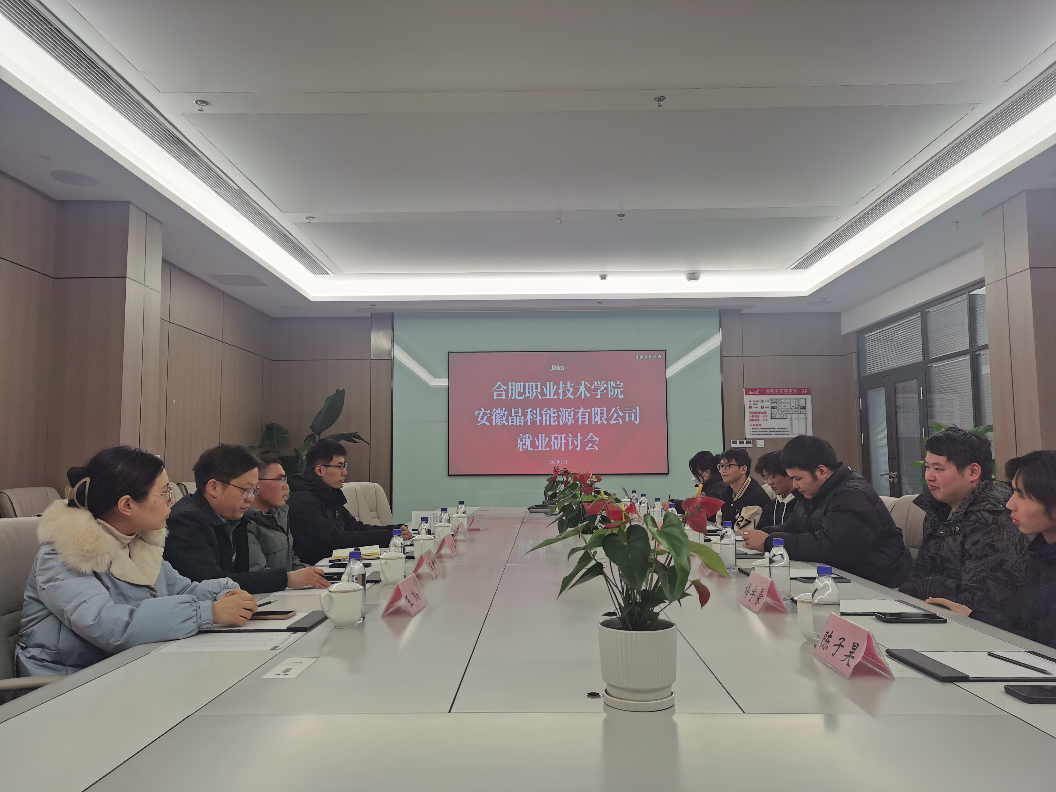在人员介绍之后开展了师、生、企业三方座谈会。首先每位同学都对自己的岗位以及负责的具体职责进行了介绍,也聊了岗位实习过程中的收获与进步。宋忠春随后表示:晶科企作为行业龙头,平台很好起点很高,虽然工作务重,但是每天都可以学习到技术,每天都在进步,这是最重要的。其余老师也纷纷说出了自己看法:同学们在工作中要稳住心态,抓住就业机会,扎稳基础深耕技术,不要眼高手低;要注意操作安全,不要因为技术熟练了产生懈怠感;同时要注重企业晋升的路线,做好人生规划,更叮嘱了同学们按时保质完成岗位实习任务。同时,师生就校内课程和岗位需求的匹配度展开了讨论,学生表示在课堂上学到的知识是岗位工作的基础,必须学好课堂知识才能更好的参与工作;岗位工作是课堂知识的拓展与延伸,而接触、掌握最先进的技术还是要到工作岗位中去实践。