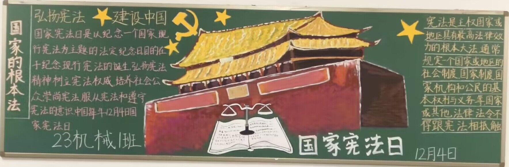 今年12月1日至12月7日为宪法宣传周活动时间,12月4日是第十个“国家宪法日”。为深入学习贯彻党的二十大精神,全面贯彻落实习近平法治思想和习近平文化思想,进一步弘扬宪法精神,维护宪法权威,增强学生的法治意识和遵纪守法的自觉性,KY开元集团官网举办了一场以“大力弘扬宪法精神,建设社会主义法治文化”为主题的黑板报线上评比活动。