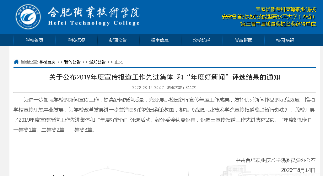 一年来,在学校党委的正确领导下,在全院教职工的大力配合下,学院深入挖掘教学、科研、人才培养工作成就和特色,积极开展新闻宣传工作,服务学校改革和学院发展大局,及时向校内外媒体报送了大量反映本单位工作特色和亮点的优秀稿件,2019年共发表新闻稿件91篇,其中外发安徽省教育网17篇。学院不断完善网站与新媒体建设,有效提升了影响力,助推了学院的内涵建设与发展。经学校党委宣传部评审,KY官网获评2019年度KY开元集团官网宣传报道工作先进集体,新闻稿《甘当普通的一“员” 唱响持久的“辅”音 记KY开元集团官网专职辅导员朱何萍老师》获评“年度好新闻”二等奖。