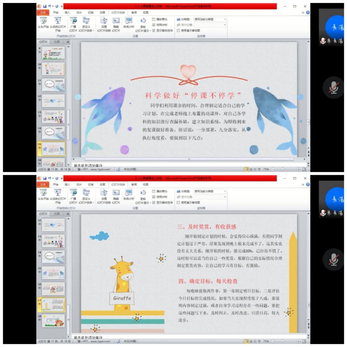 本次讲座主要包含四个方面,分别是:理性看待疫情、正确认识自我、心理自助方法以及科学做到停课不停学。培训开始时,介绍现如今的疫情形势变化,理性看待疫情,做到不恐慌,不信谣,不传谣。其次,要正确的认识自我,合理应对情绪问题,保持积极向上的心态;并且为同学们提供有利于自我协调的心理自助方法,例如保持良好的作息规律,适当运动放松,找他人倾诉等等。最后,在特殊时期的线上教学,要求同学们做到“停课不停学”,并提供高效学习方法。