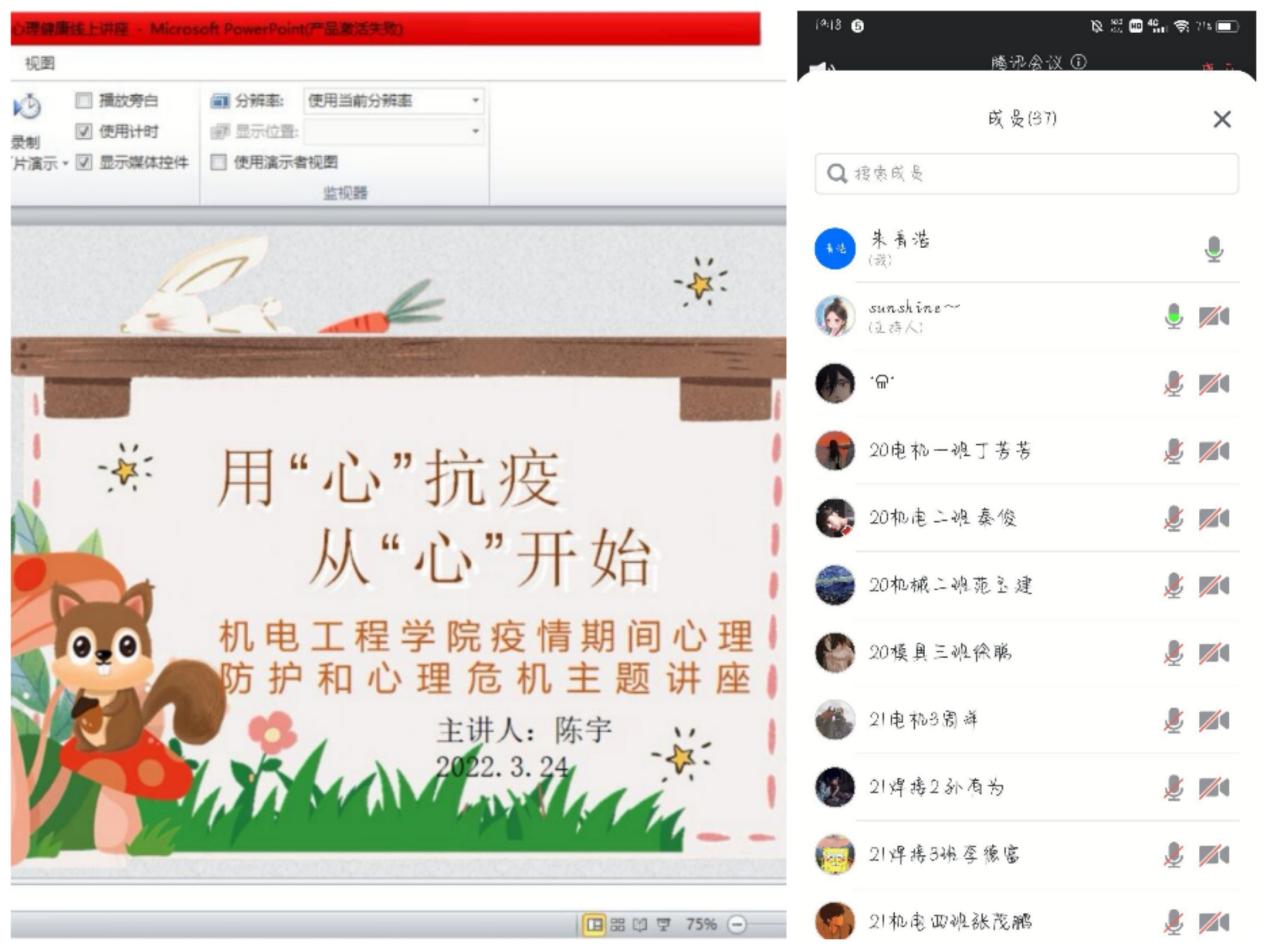 为疏导大学生在疫情封校时期导致的心理压力,3月24日18:30,KY开元集团官网陈宇老师通过腾讯会议,为2020、2021级各班心理委员召开“用‘心’抗疫,从‘心’开始”疫情期间心理防护与心理危机线上培训讲座,通过讲座学会自我调节方法,增强心理免疫力,进而帮助更多需要帮助的同学。