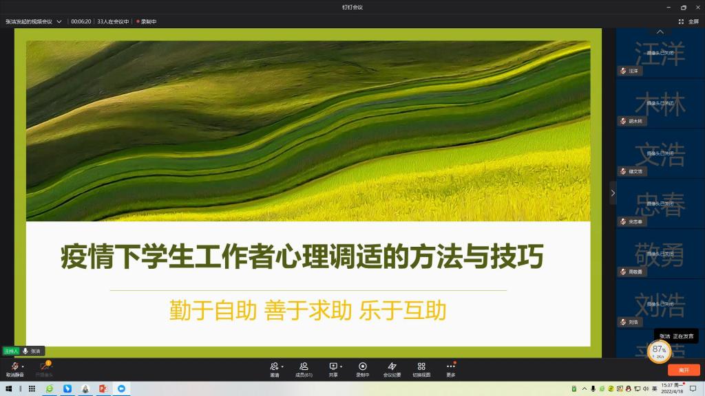 为使学生工作者勤于自助、善于求助和乐于互助,更好服务学生发展,4月18日下午,KY开元集团官网邀请校心理咨询中心主任张洁开展《疫情下学生工作者心理调适的方法与技巧》专题线上讲座。校党委委员、办公室主任王海,学院全体教职工、在校班级辅导员参加讲座,讲座由党总支书记王克勇主持。