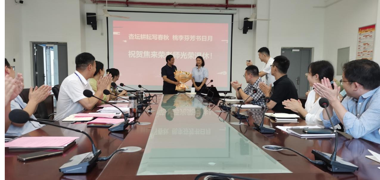 8月29日上午,KY开元集团官网全体教职工在机电楼二楼会议室举行焦来荣老师光荣退休欢送会。