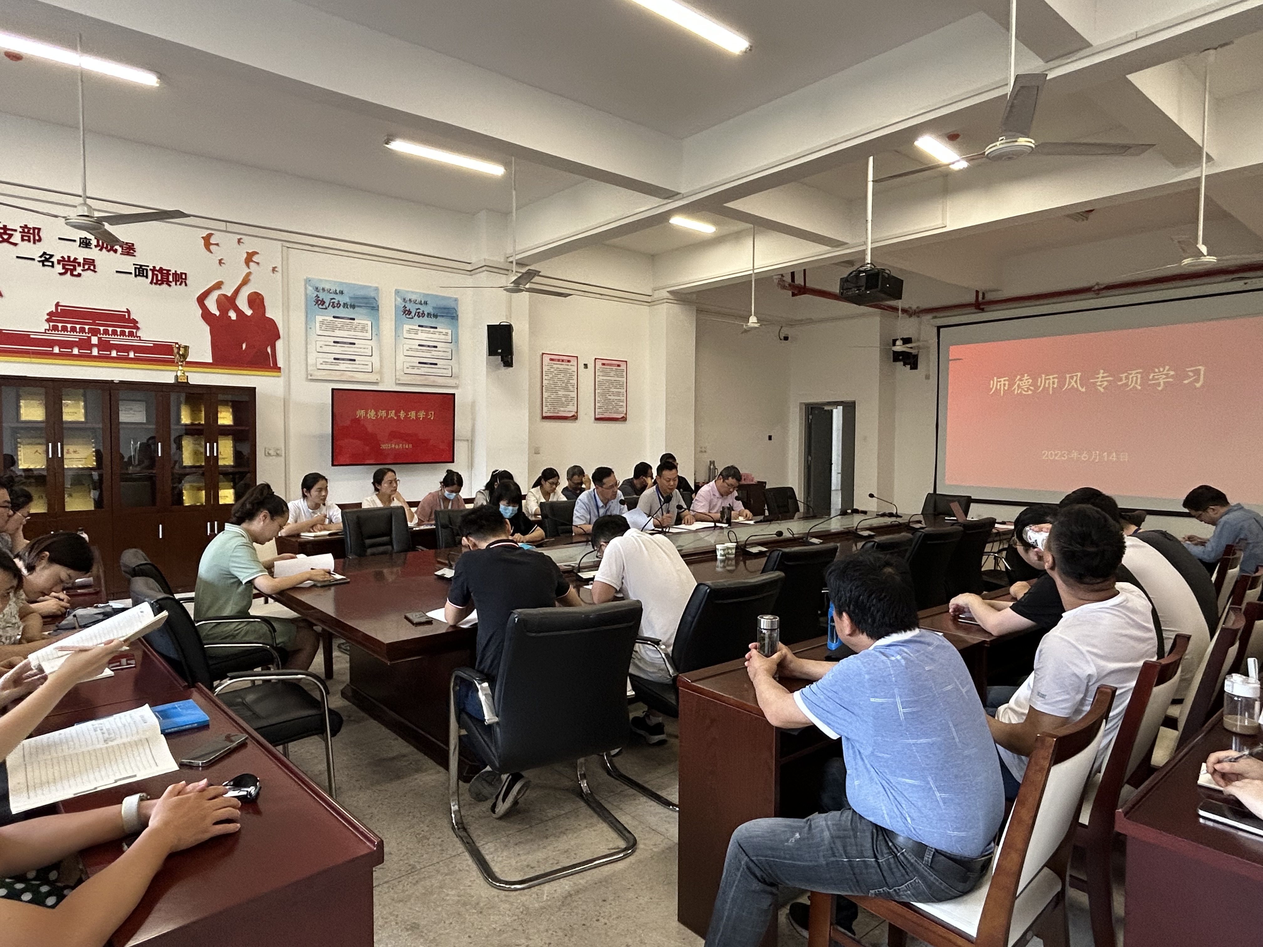 6月14日,KY开元集团官网在机电楼二楼会议室召开六月份党员活动日暨师德师风专项学习活动,KY开元集团官网全体教职工参会,会议由党总支副书记丁迎春主持。