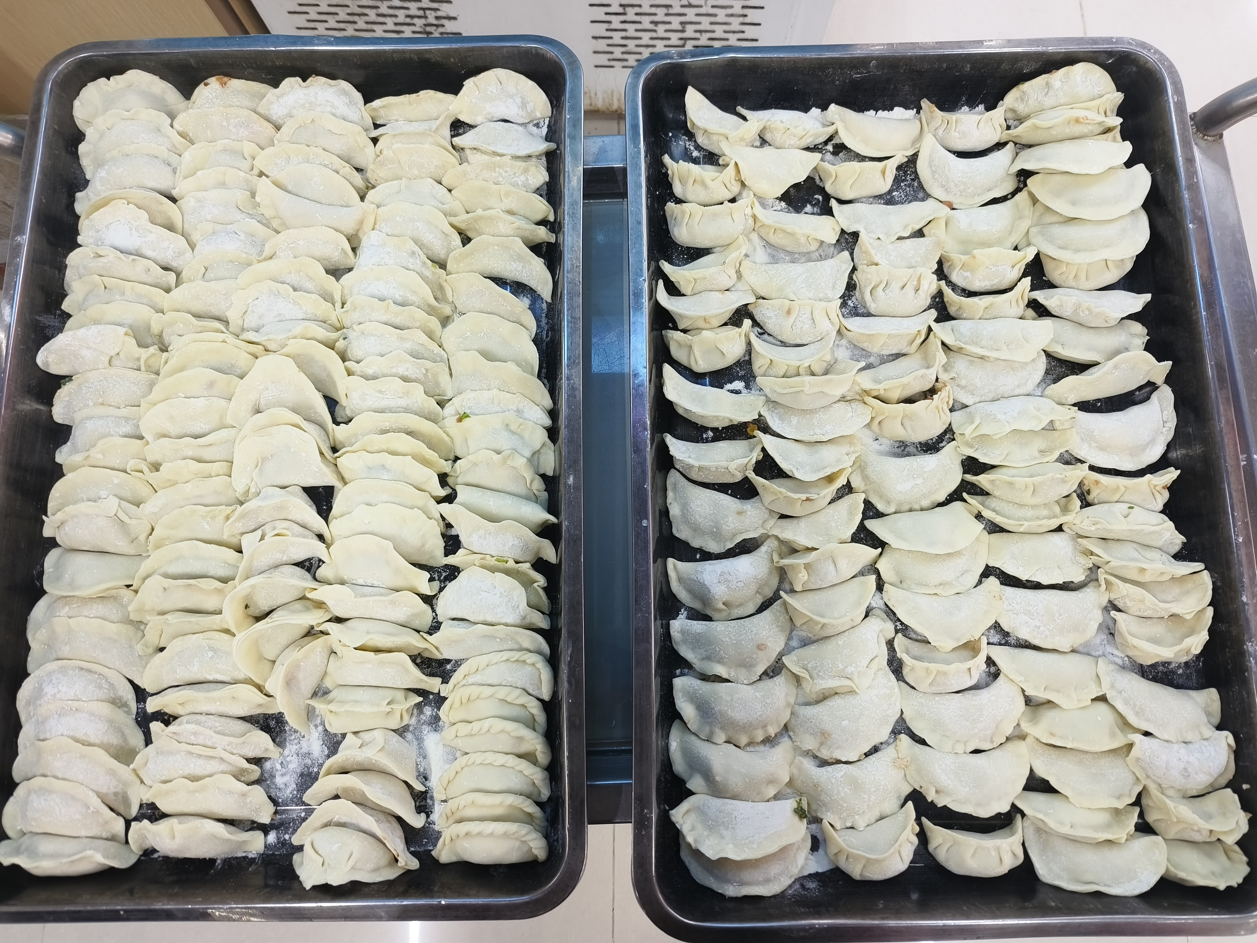 活动过程中,志愿者们提前将准备好的饺子皮、面粉、馅料等食材和工具整齐地摆放在桌上。这次的馅料丰富多样,有猪肉馅、芹菜猪肉馅、猪肉玉米馅等,同学们纷纷摩拳擦掌,依次有序就座准备开始包饺子。有的同学手法娴熟,将饺子皮在手中摊开,放上馅料,轻轻一捏一折,一个个精致饱满的饺子便呈现在大家眼前;有的同学则略显生疏,面对饺子皮和馅料显得有些手忙脚乱,但他们耐心跟着食堂阿姨认真学习,逐渐掌握了包饺子的技巧,包出的饺子也逐渐有模有样。