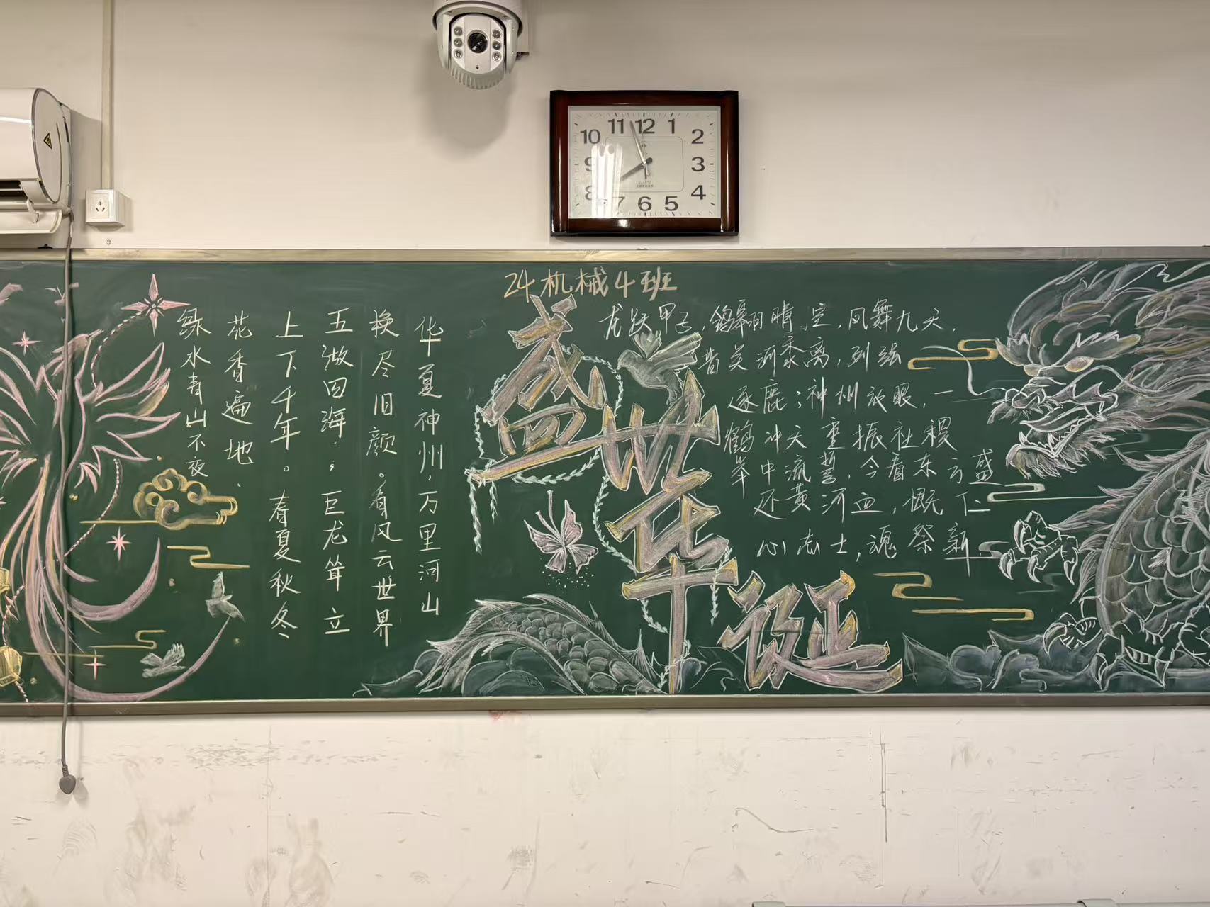 不少作品格外亮眼:有的以亮眼字体突出“盛世华诞”主题,旁配层叠青山与飞檐宝塔,粉紫飘带缠绕塔身,“山河壮丽 岁月峥嵘”题字一写,家国辽阔意境立显;有的用银白勾边勾勒主题,似裹着月光般醒目,一侧画鳞爪分明的银龙,配“华夏神州,万里河山”诗词与流云纹路,藏尽家国豪迈,再缀上凤凰纹样与星芒,更添灵动。其他班级也不含糊,或用山水晕染盛景,或用烟火点染节日氛围,每笔色彩都藏着热忱。