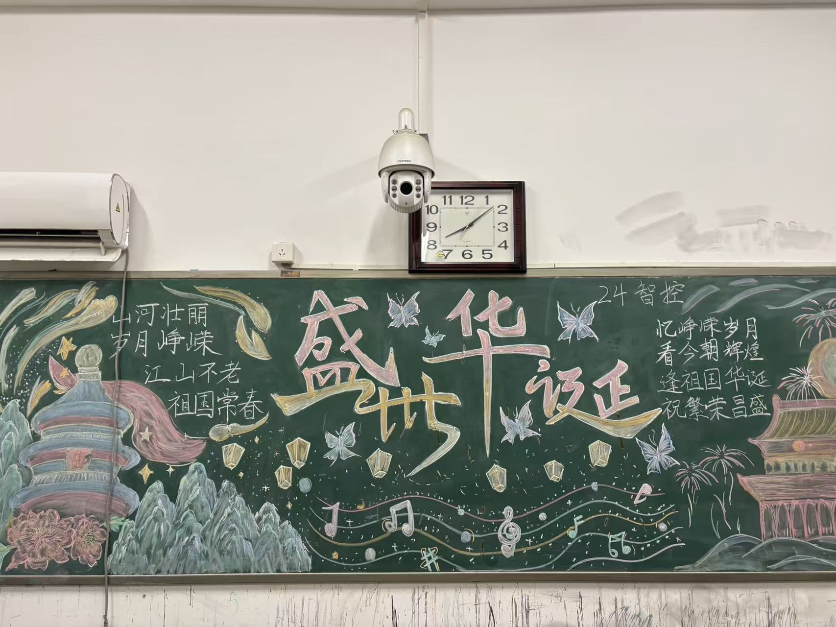 本次活动得到各班级积极响应,同学们围绕“国庆”主题,结合历史文化、时代风貌等元素精心创作:黑板报内容涵盖家国发展、时代精神、节日祝福等维度,以图文结合的形式展现出对祖国的热爱与祝福,版面设计兼具创意性与观赏性,风格或大气恢弘、或细腻生动,同学们以粉笔为笔、黑板为卷,将家国深情凝注在一方黑板之上:各班围绕“国庆”主题深挖创意,把山河盛景、时代气象揉进色彩与线条里。