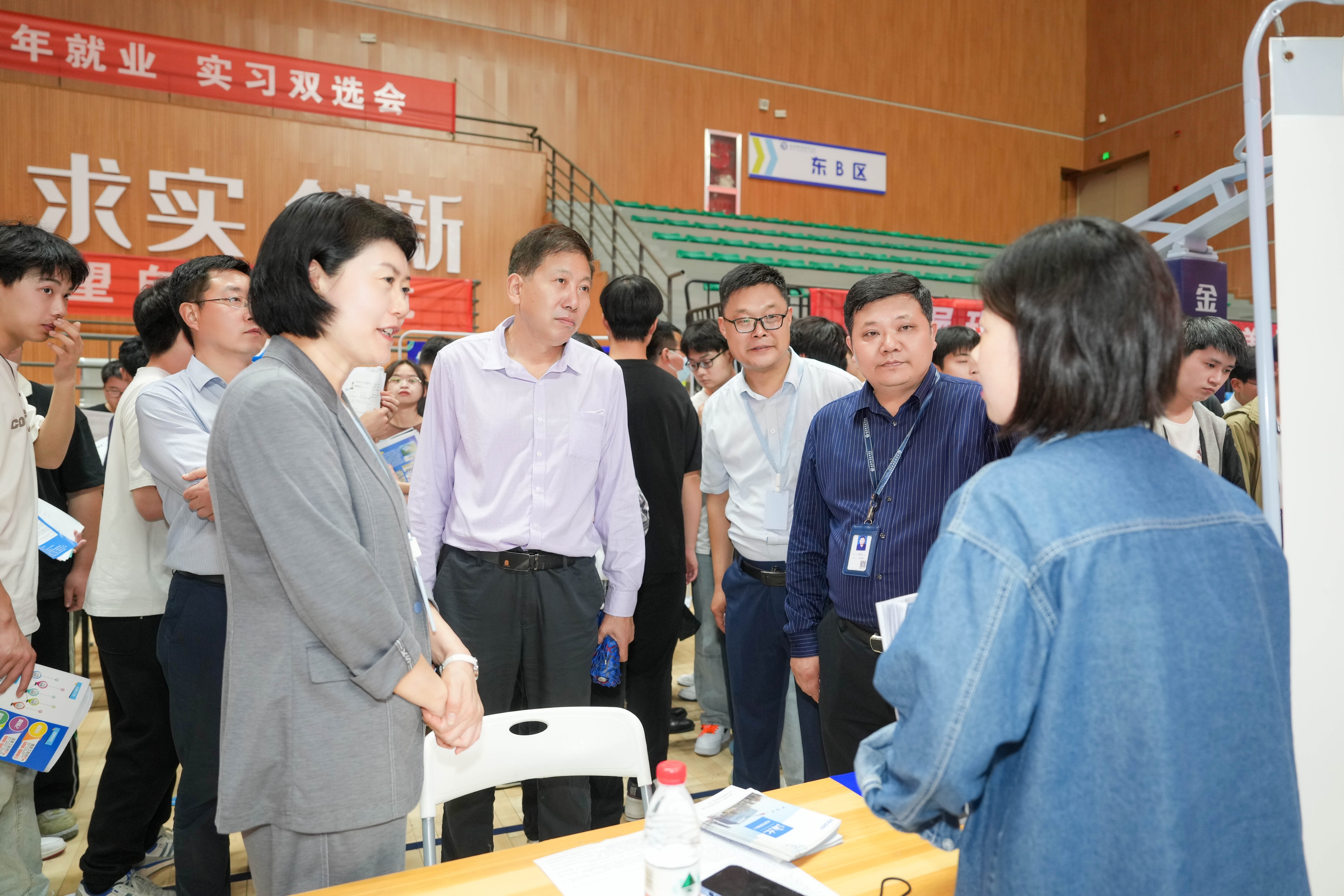 省教育厅大中专毕业生就业指导中心相关领导、合肥市新站区、经开区、巢湖市人社局领导来到双选会现场,学校党委书记王杰才,副书记金飞燕,党委委员、组织人事部部长张如宝,学生处处长尹宗平与来校企业代表和参会学生进行亲切交流。