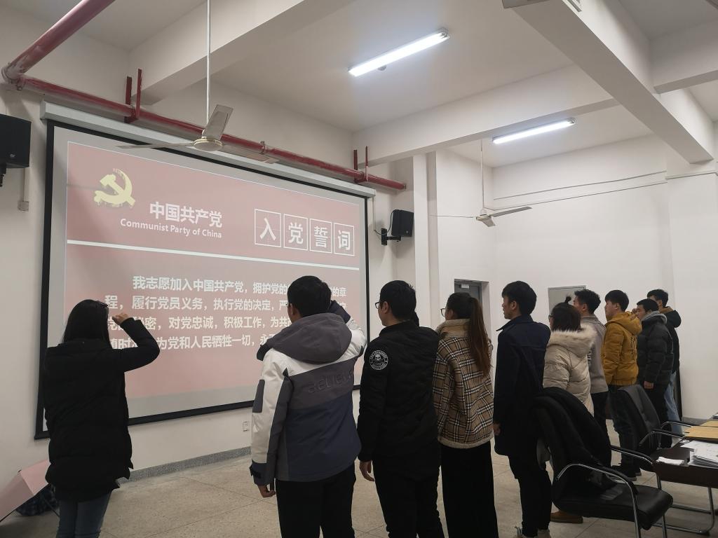 会议最后,徐婧婧同志带领预备党员们宣读入党誓词,大家排成一排,手握拳头,举至头顶,用着铿锵有力的声音念着誓词,高亢激昂的声音久久回荡在会议室。