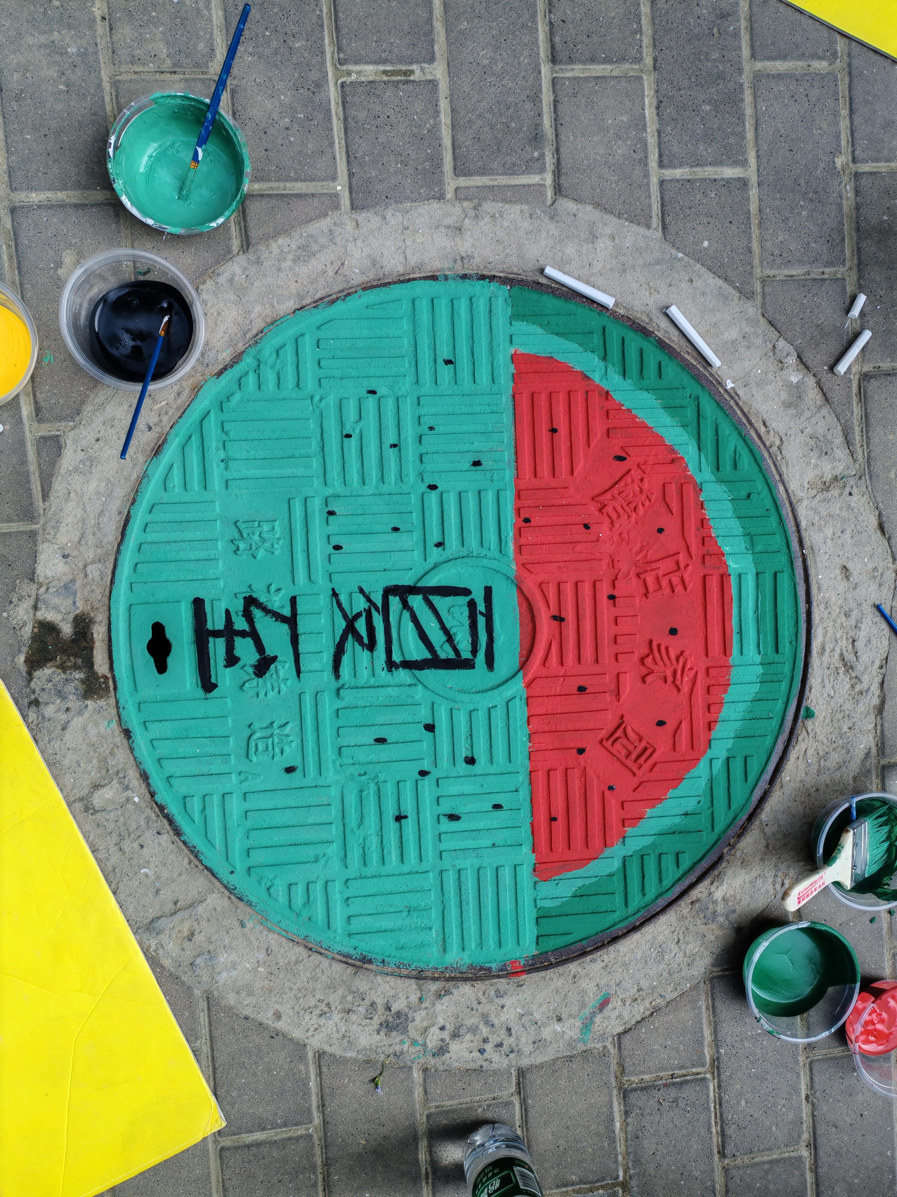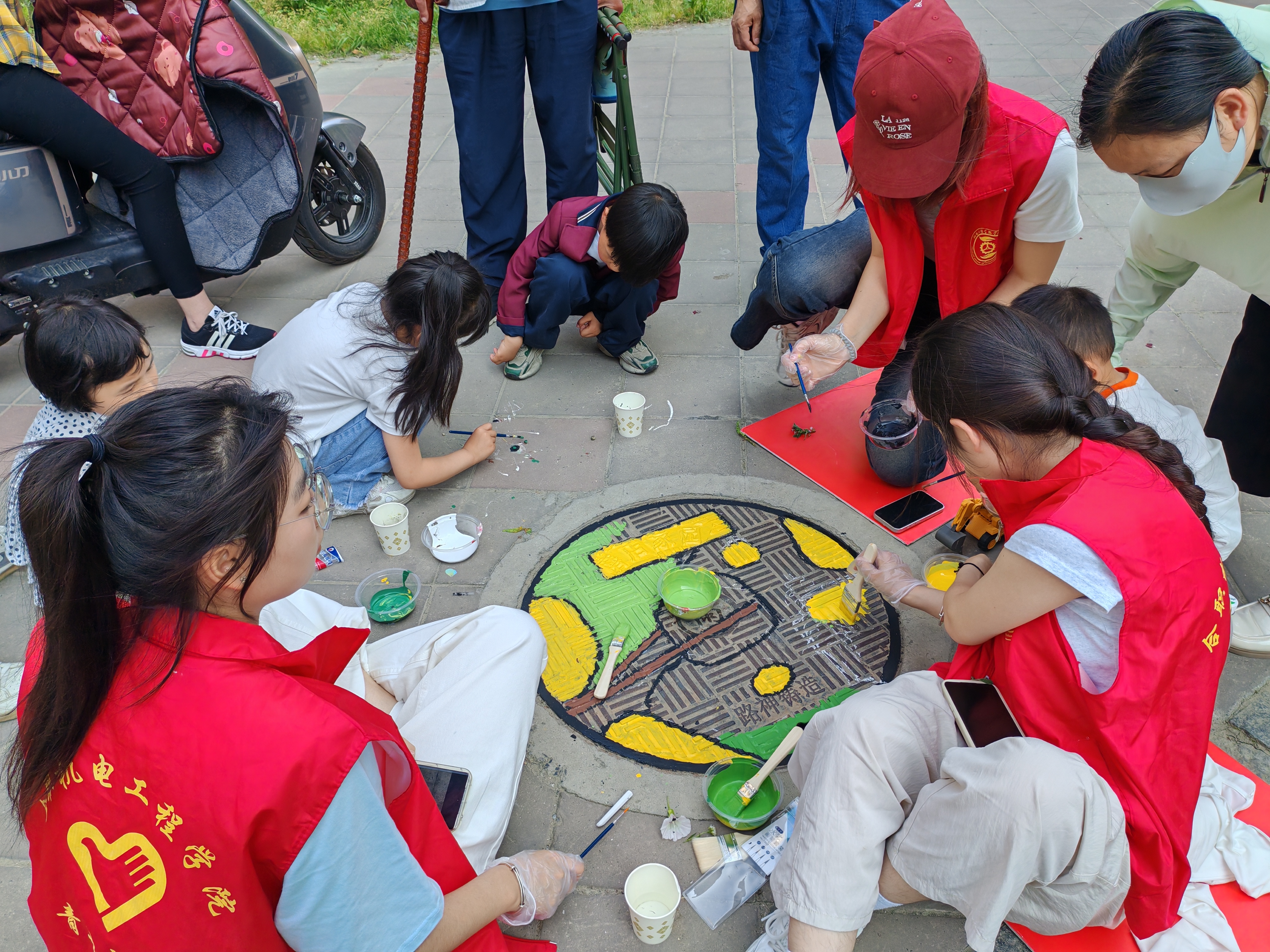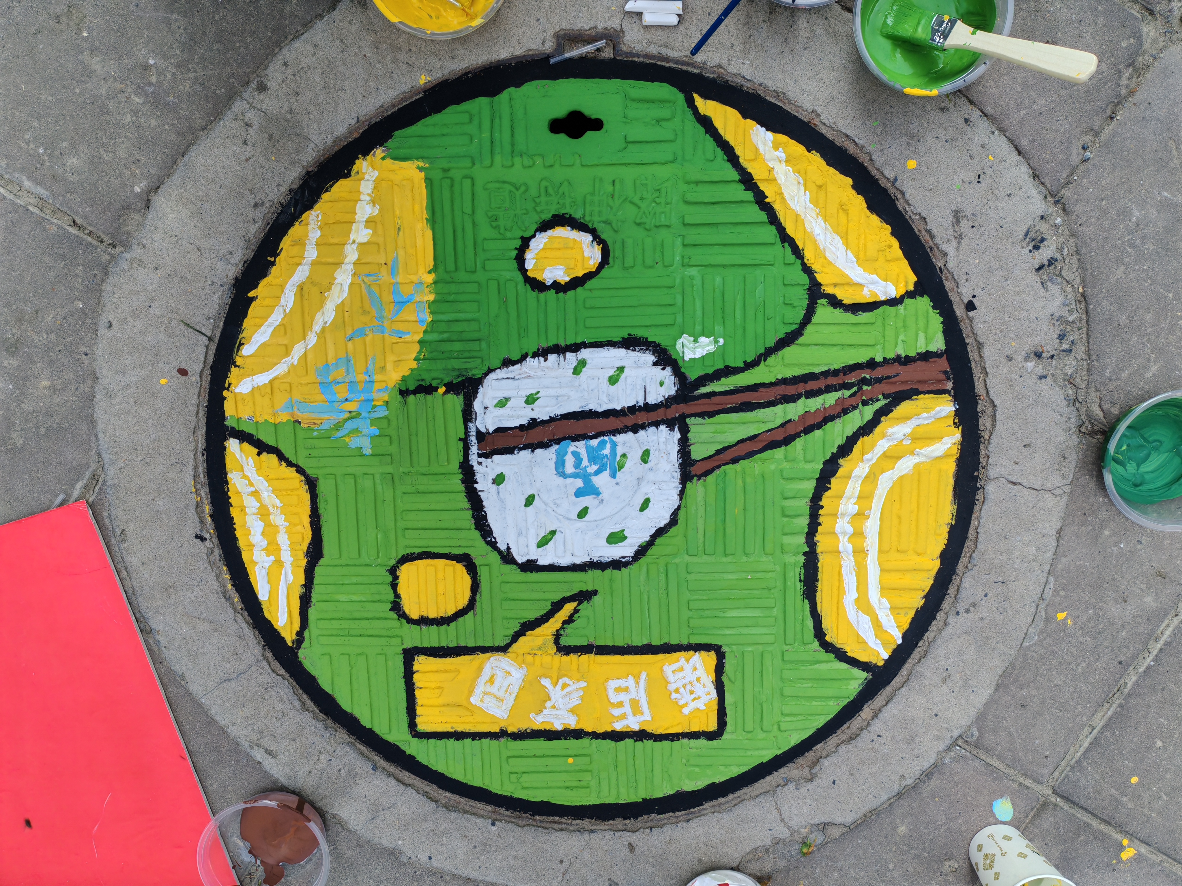 当天下午,志愿者们带着绘画工具兴致高昂的来到活动场地。大家三五成群清扫井盖之后,手持画笔,勾轮廓、刷底色、填色、修边。同学们围绕中华优秀传统文化,将“二十四节气”作为绘画主题,充分发挥自己的想象力和创造力。经过大家的协作配合,一个个不起眼、普普通通的井盖焕然一新。