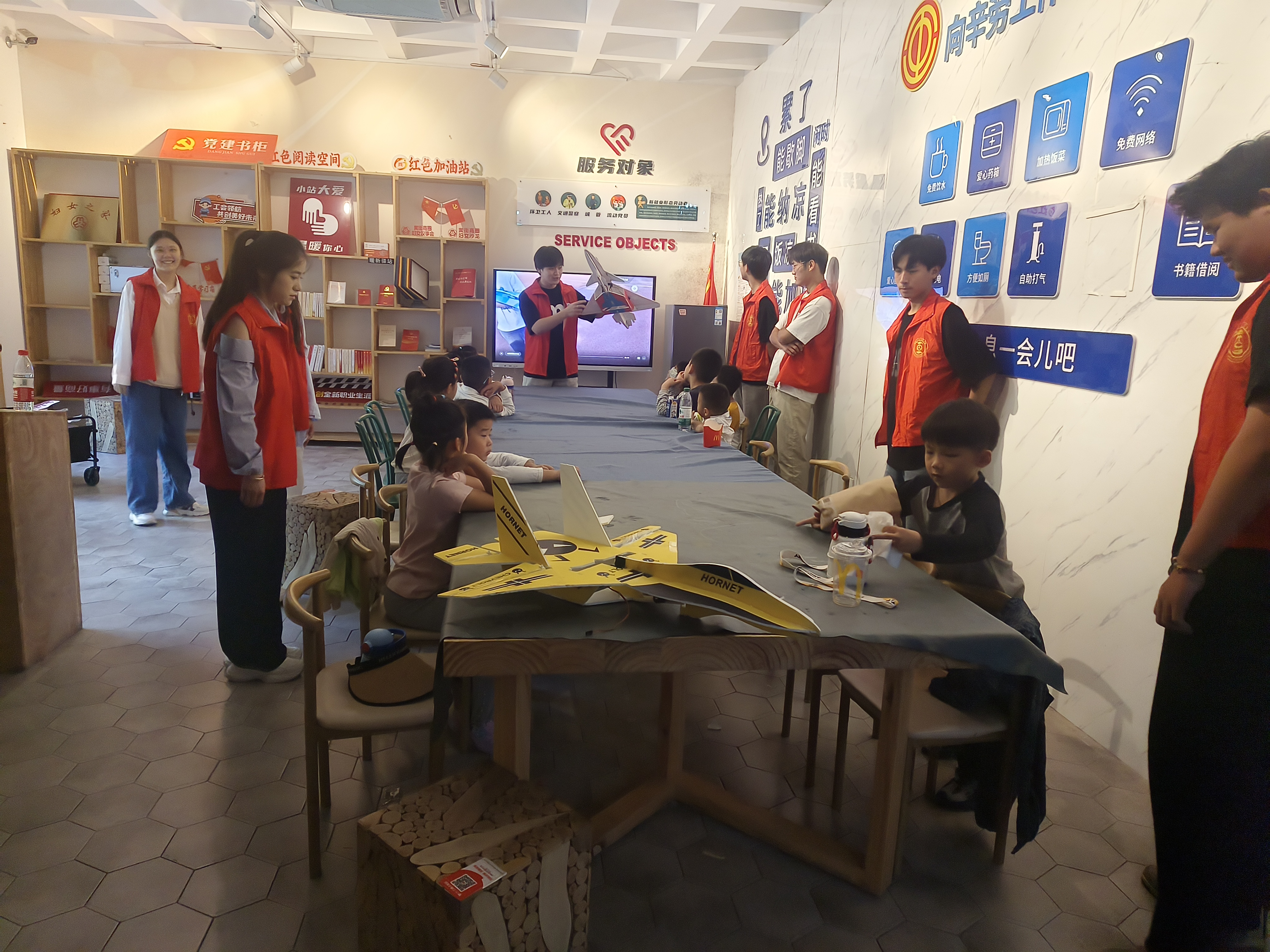 为了向社区少年普及科学知识,传播科学思想,弘扬科学精神,树立科技兴国的信念,形成学科学、爱科学、用科学的科技文化氛围。新站磨店社区与KY开元集团官网团总支达成合作,邀请大学生志愿者们走进社区,定期开展“科普知识宣讲”活动,引领青少年接近科学、走近科学,提高青少年的科学文化素质。9月22日下午,KY开元集团官网“小螺钉”志愿服务队、航模协会成员来到磨店社区黉街悦书房书店和社区工作人员一起开展航模科普活动。