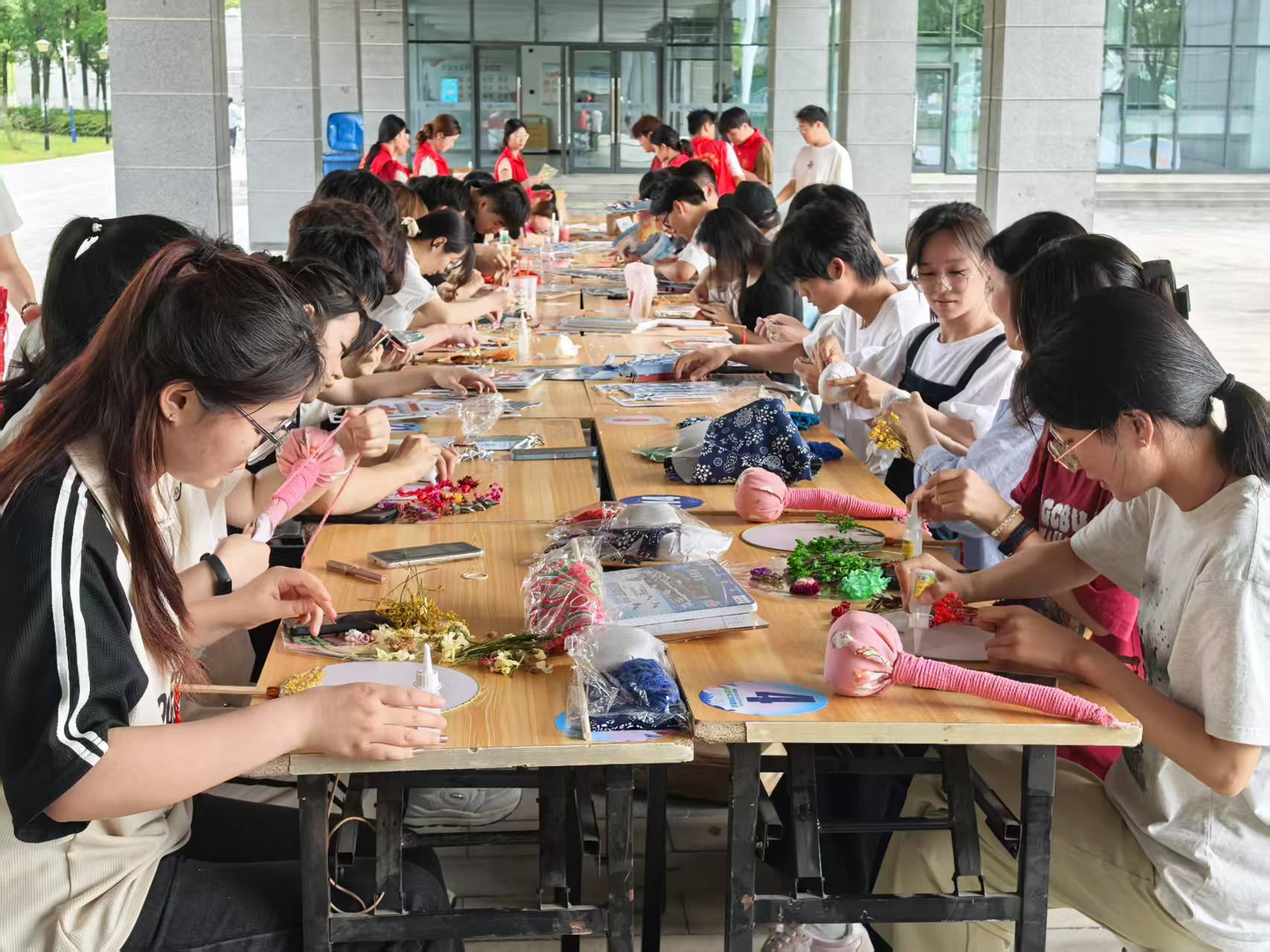 创意手工区吸引了众多手工爱好者。志愿者们提前准备了南湖红船模型、永生花团扇及养生锤材料包,并现场讲解制作技巧。在红船拼装环节中,同学们通过榫卯结构还原中共一大历史场景,感受“红船精神”的深刻内涵;团扇制作区花香萦绕,女生们将干花与古典扇面结合,创作出独具匠心的作品;养生锤则融入中医文化,制作完成后被赠予现场教师,传递感恩之情。一件件作品不仅是动手实践的成果,更成为红色教育与劳动教育融合的生动载体。