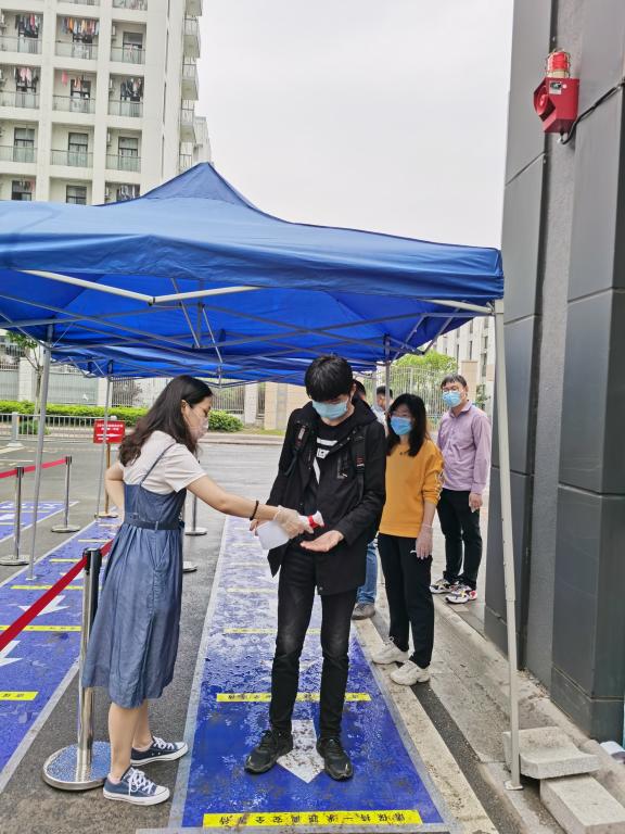 上午老师们早早地来到了学校北门,伴随着春雨绵绵和校园的芬芳静待学子归来。8时30分,首位返校学生来到了北门,在老师们的引导下顺利进入校园。学生返校前院党总支副书记(主持工作)王克勇已做了详细的工作要求,并结合《KY开元集团官网2020届毕业生返校工作流程图》对现场人员进行了明确分工与安排,保证了当天返校工作有条不紊的进行。返校现场同学们间隔一米以上,有序排队入校。每名进入校园的学生需依次完成测量体温、安康码核验、双手消毒、口罩更换、身份验证、入校登记、发放《返校指南》等流程,一切正常后方可进入校园,体温如有异常情况将由工作人员引导到留观室由校医院医生处理。