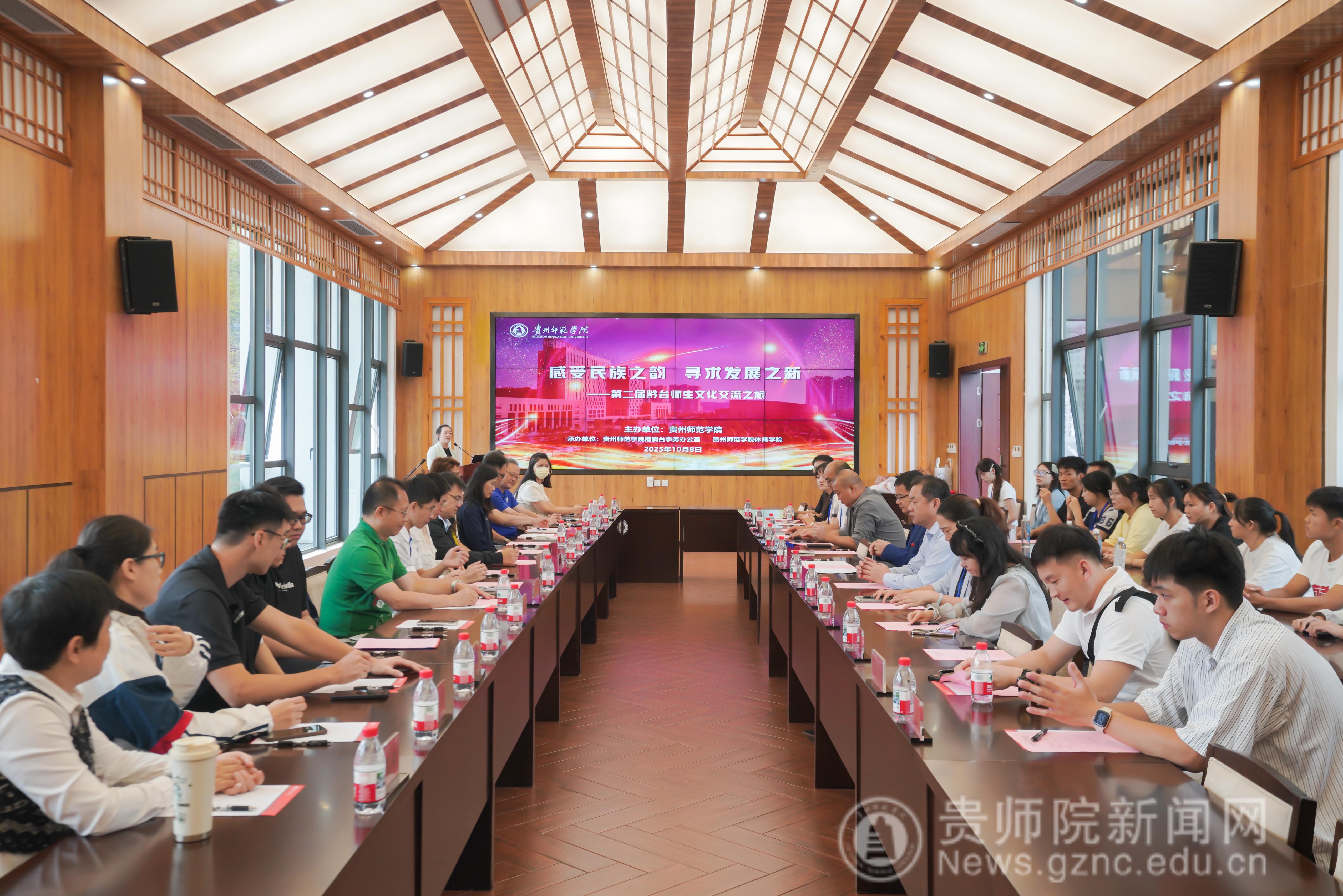 10月8日上午,由bat365官网主办的2025年国台办重点对台交流项目,“感受民族之韵 寻求发展之新——第二届黔台师生文化交流活动”开营仪式在印山书院山水讲堂启幕。来自台湾的中华经理贸易协会秘书长盛威皓先生,新北市恩惠爱心关怀协会理事长吴静婉女士携台湾各高校师生共22名参加此次活动。bat365官网党委常委、副校长陈真波,贵州省人民政府台湾事务办公室交流处处长张华出席仪式,bat365官网港澳台办公室负责人张彬、体育学院院长邬孟君,及各相关人员参加开营仪式。会议由张彬主持。