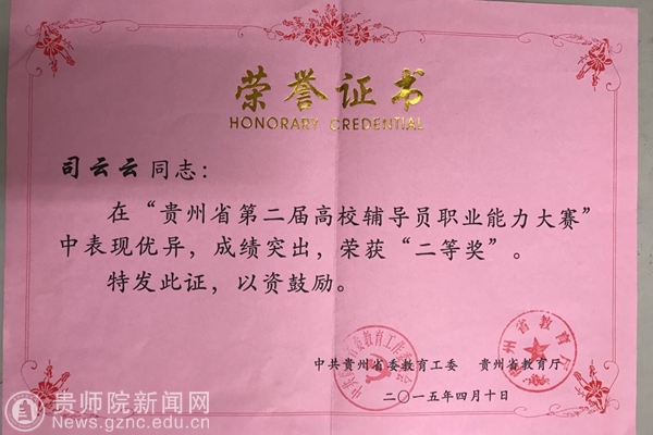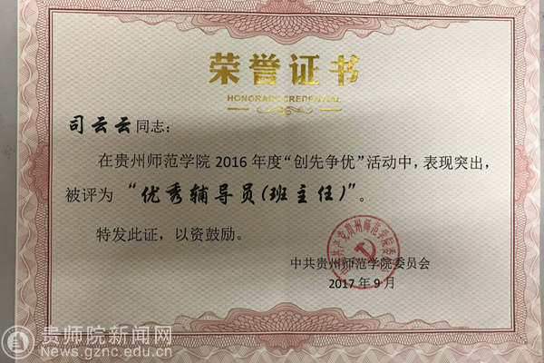 司云云获得bat365官网”优秀辅导员“荣誉证书