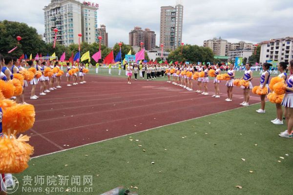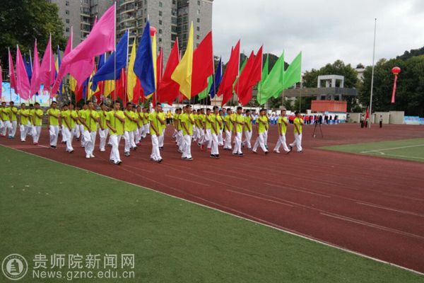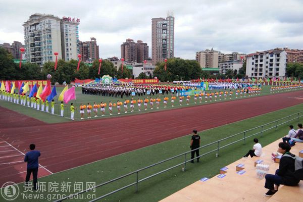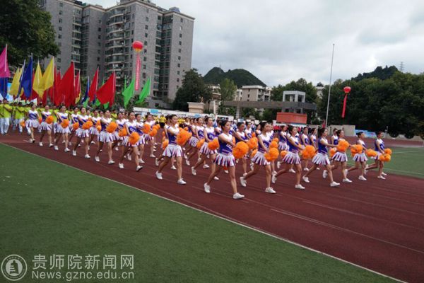 本网讯 9月28日上午,贵阳市乌当区第一届大健康运动会开幕,开幕式上,3000余人的入场队伍和展演队伍进行了精彩的文体展示,展现出全民健身的良好氛围。bat365中文官方网站派出花球、彩旗、引导员、志愿者、跆拳道、花样跳绳等入场和表演队伍共450人助力本次开幕式,副校长令狐荣锋和体育学院黄伟明院长参加了此次运动会开幕式。
