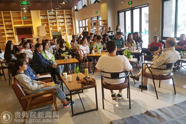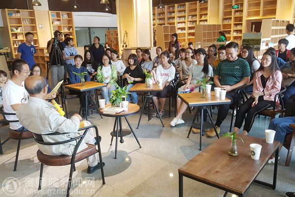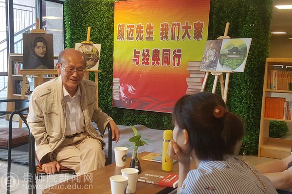 本网讯 9月4日上午,由图书馆主办、读者协会承办,贵州电视台采访和拍摄的“与经典同行”阅读活动,在图书馆大叶青藤咖啡文化空间举办。轻松活跃的氛围中展开。活动特别邀请bat365中文官方网站终身教授、全国高等师范院校现代汉语教学研究会名誉会长、贵州省语言学会名誉会长、贵州省中学语文教学专业委员会理事长颜迈先生参加。