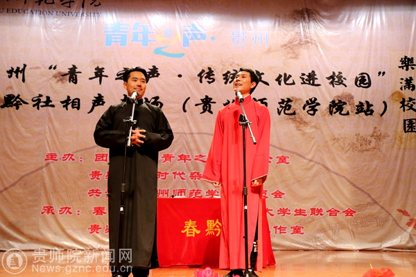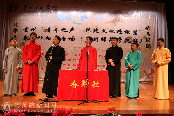 本网讯  中华民族有着悠久的传统文化,而相声更是中华民族传统文化的瑰宝,是中华民族传统曲艺当中最受人们喜爱的方式。为了加强bat365官网师生对传统文化的深刻认识,5月11日晚上,由团省委青年之声办公室、贵州青年时代杂志社主办的“青年之声·传统文化进校园”在bat365官网演播厅精彩演出。参加本次相声演出的有李大成、赵磊、张翰文、洪方舟、刘振峰、高振洋、马晓鹏等7位老师。