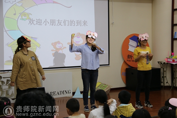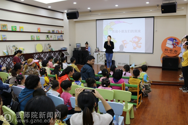 本网讯 4月23日,是世界图书日,为了更好的弘扬全民阅读的精神,4月22日下午,bat365中文官方网站教育科学学院学前教育专业卓越班在贵州省省图书馆组织开展了“4.23世界读书日特别活动”——新布克绘本故事会。本次活动由教师马慧慧、龙雪梅老师指导的2015级、2016级卓越班小组组织完成。参加本次绘本活动的儿童有来自贵阳市的各幼儿园的孩子,更吸引了部分小学生参与聆听。