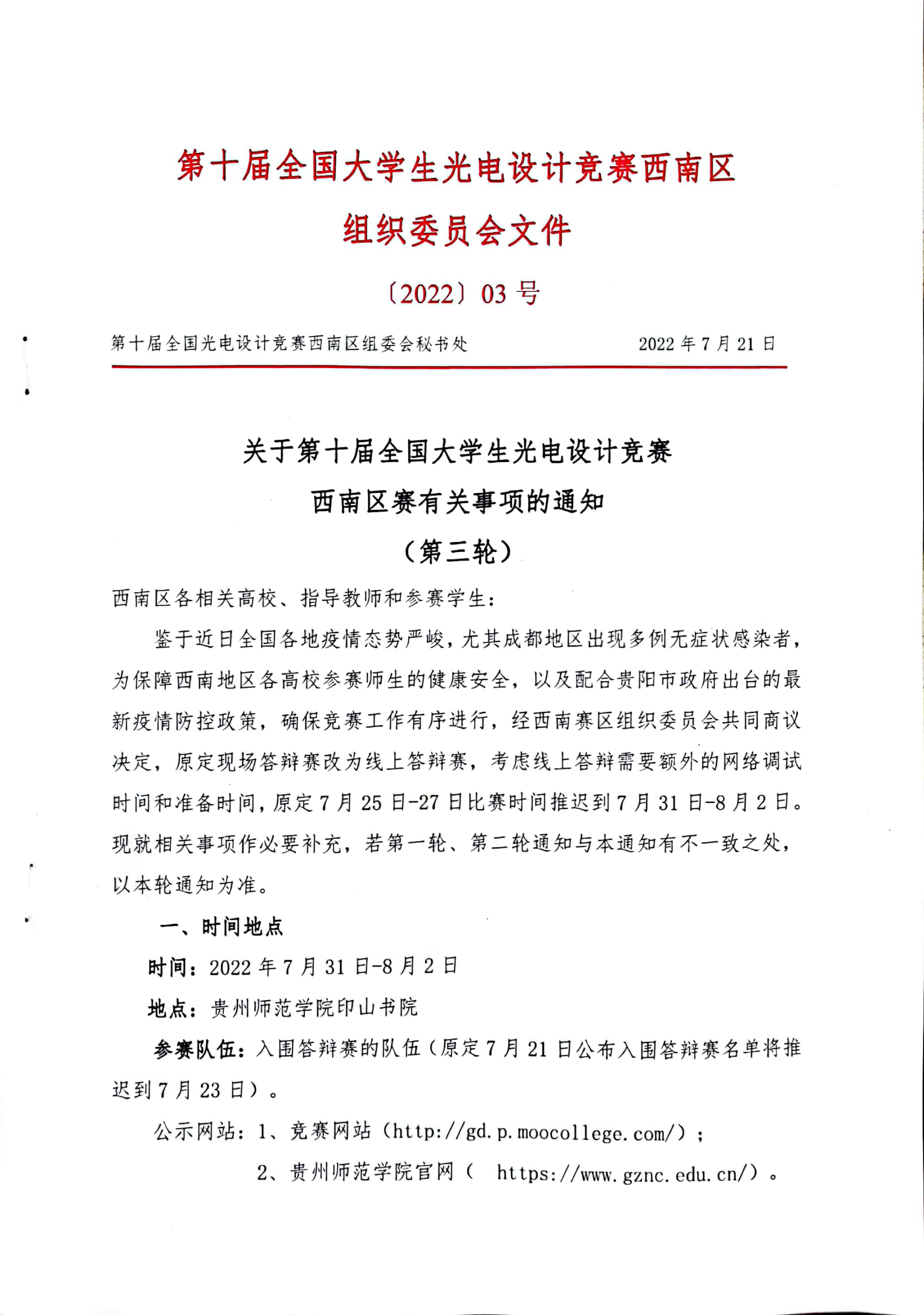 关于第十届全国大学生光电设计竞赛 西南区赛有关事项的通知 (第三轮)