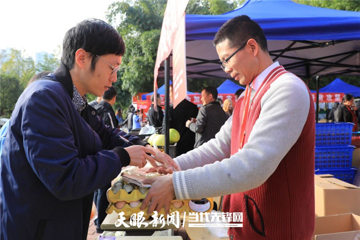 赵政(左)在省内农特产品展销会上售卖帮扶村农产品