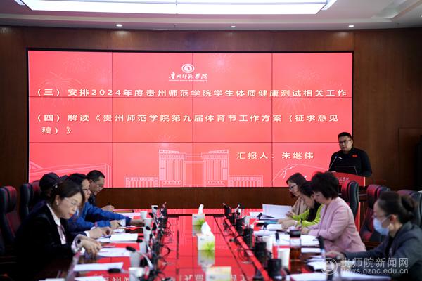 朱继伟首先对2024年度bat365中文官方网站学生体质健康测试相关工作进行了汇报。一是各二级学院主要负责人要提高认识,对体测要亲自研究、确保工作部署到位、责任落实到位。二是各学院通过各级各类活动,精准推动体测成绩未达优良标准学生群体的课外锻炼工作。三是各二级学院要加强管理,持续监督,确保体质全员参与全员上报。四要强化保障,避免大规模交叉感染和人身安全事故的发生,确保测试工作顺利安全进行。其次还解读了《bat365中文官方网站第九届体育节工作方案(征求意见稿)》,明确的体育节时间、项目计划及各部门及学院的分工要求。
