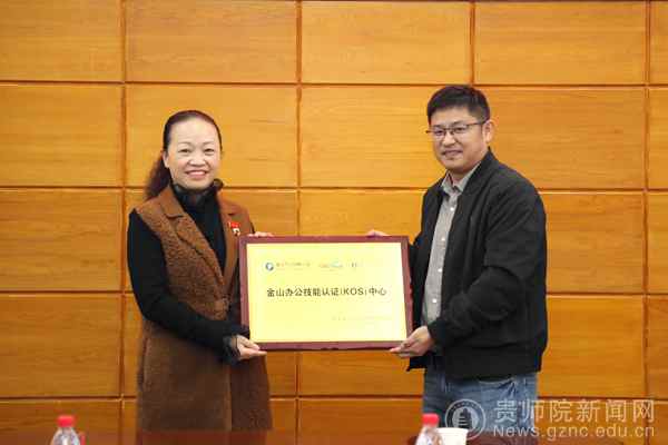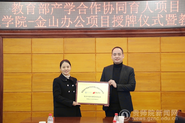 授牌仪式上,李艳琴教授与邓华代表双方单位就教育部产学合作协同育人项目立项单位进行授牌,邓华代表金山公司为项目负责人左欣颁发教育部产学合作协同育人项目立项证书,邓琴教授与万斌总监代表双方单位就金山办公技能认证(KOS)中心进行授牌。