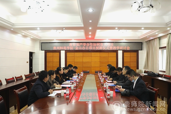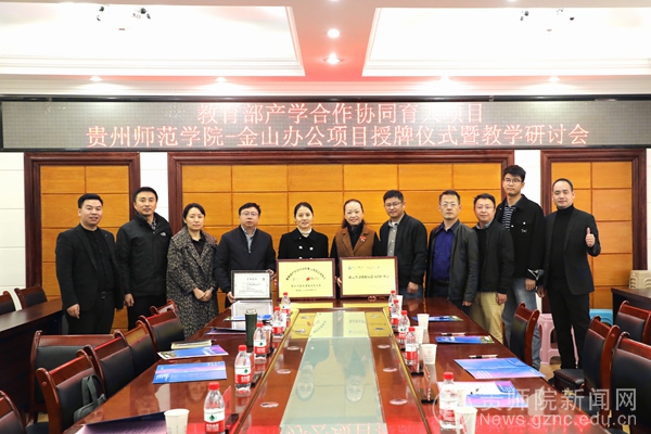 本网讯 11月16日上午,教育部产学合作协同育人项目授牌仪式,暨bat365中文官方网站与珠海金山办公软件有限公司合作教学研讨会在数学与大数据学院会议室举行。教务处长处长邓琴、科研处副处长李佩、数学与大数据学院党委书记李艳琴、副院长熊伟程、物联网工程系主任崔忠伟、计算机科学与技术系主任暨项目负责人左欣,金山办公高级总监万斌、生态总监肖璨、产学项目负责人邓华、技能(KOS)认证贵州负责人丰佩虞,贵州省服贸协会秘书长张树军等出席授牌仪式及研讨会。会议由数学与大数据学院党委书记李艳琴主持。