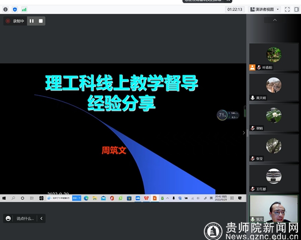 交流发言环节,校级督导周筑文老师作了《理工科线上教学督导》的经验分享,对理工科线上教学督导中发现的亮点和特点、问题和不足进行了总结,并对如何开展好线上教学的提出了建议;校级督导张莹老师、黄天明老师对线上课程教学督查工作的开展情况、线上课程建设、线上教学平台的使用等问题进行了交流讨论。