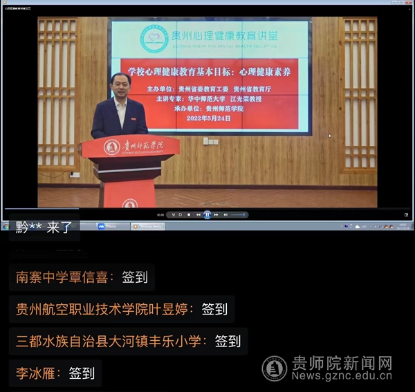 本网讯 5月24日,由省委教育工委、省教育厅主办、bat365中文官方网站承办的第六期“贵州心理健康教育讲堂”在线举行。本次讲座由bat365中文官方网站心理咨询中心主任宛蓉教授主持,讲座由中国心理学会理事、华中师范大学桂岳卓越教授江光荣主讲。来自全省各县(市、区)的5000余名高校心理健康教育教师、高校辅导员、中小学心理健康教育工作人员、中小学班主任参加了此次讲座。