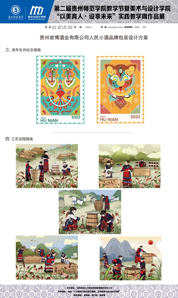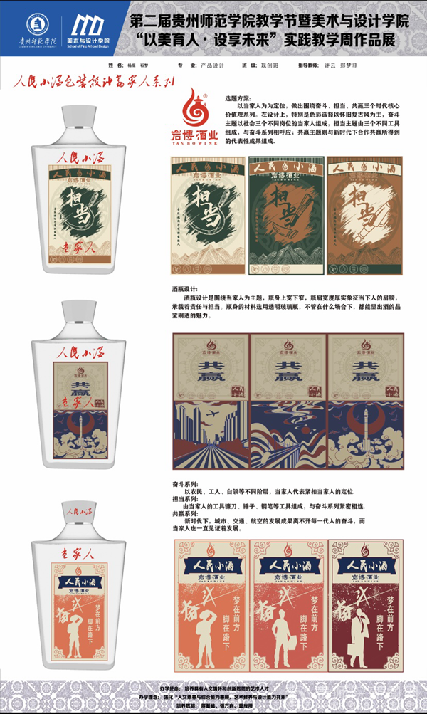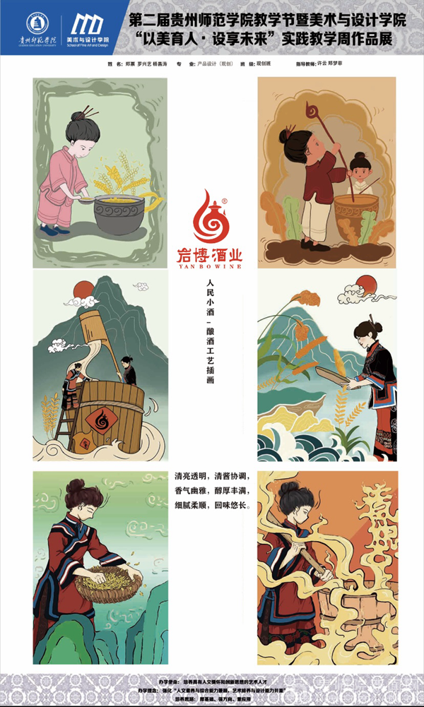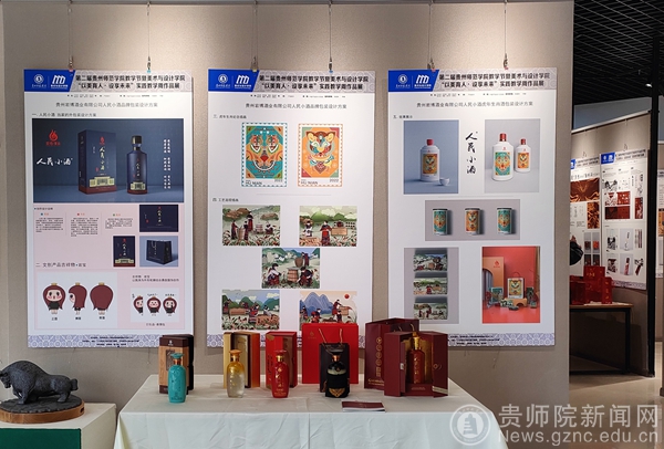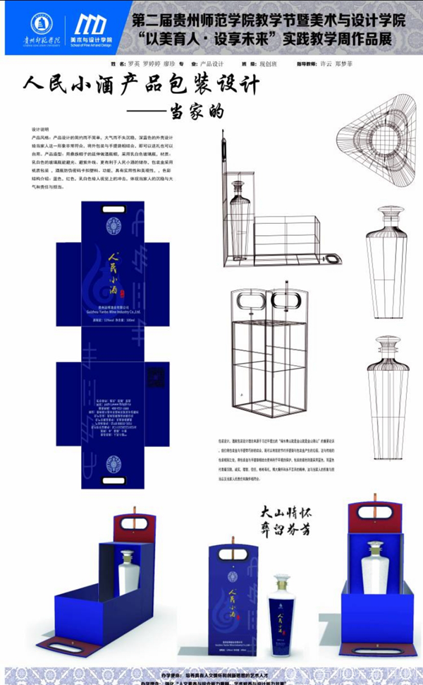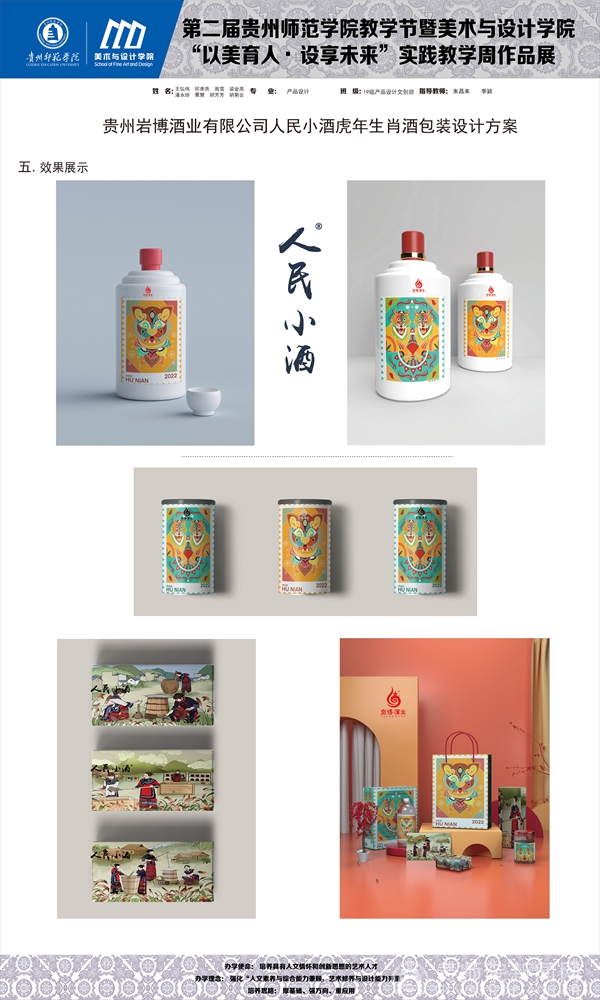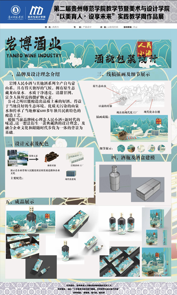聂森首先介绍本次教学实践周的教学成果,针对岩博酒业开展设计服务,产品包装设计作品共有24组作品,数字媒体艺术影视广告作品共有16组作品;贵州晨曦商贸有限公司设计作品15组、醉美偏坡原味小镇文创产品10组、榕江县专题设计5组,以及其他企业产品品牌与包装设计作品40组,共计110组。大二大三学生在短时间内能创作出不少精品设计,实属不易,期待未来能有更多时间做出更精彩的作品。肖进春就包装插画设计,产品品牌形象、IP形象以及产品包装设计表示赞赏,强调后期细节进行调整优化,更适合商业应用。并提出以后有机会希望师生团队能够到人民小酒基地总部进行参观、指导、交流,促进校地合作的持续深入推进。朱昌来表示在短时间内的商业快题设计时间紧任务重,细节方面还需雕琢,细化提升设计;我们将计划在未来相关课程教学中,将各大企业的商业设计需求、企业的文化融入到课堂教学中,精心打磨,做出更优异的作品,既符合市场需求,又具有艺术感。