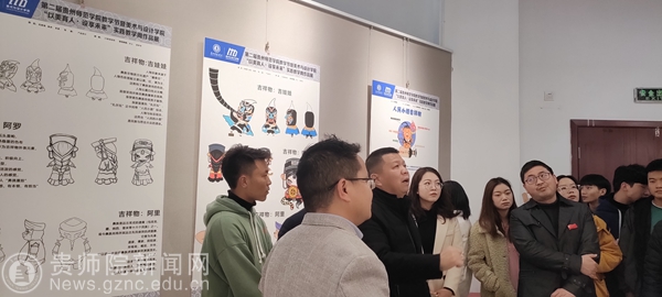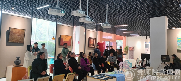 行业代表贵州岩博酒业人民小酒销售有限公司总经理肖进春、产品设计主管徐思琪等一行5人,在艺术实践工作坊仔细参观师生设计作品,并与师生进行了深度交流。教务处处长邓琴、美术与设计学院院长聂森,院基层党委书记石含洲、副院长路统宽、基层党委副书记郝进欣、公共艺术系主任朱昌来等老师,以及产品设计、数字媒体艺术专业部分学生参加交流会,交流会由朱昌来主持。