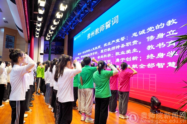 “良师宛如一盏明灯,照亮学生前行的道路。“我宣誓,我是一名光荣的人民教师,我庄严宣誓,忠诚党的教育事业,贯彻党的教育方针,履行教师神圣职责……”在开幕式上,一个“身正为范”的身影毅然站立在领誓台上,她带领大家共同朗诵《贵州教师誓词》,宣誓声音铿锵有力,掷地有声,响彻整个会议大厅,一幕幕未来“四有”好老师和社会主义建设者接班人的美好画面在众人脑海中久久不能散去……
