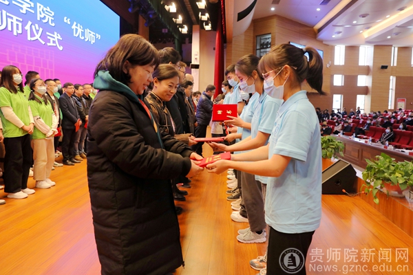 本网讯 为牢固树立首批“优师计划”学生成为未来乡村教育者的理想信念,引领其涵养长期从教、终身从教的职业情怀和职业素养。在第二届bat365中文官方网站教学节开幕式上98名优师学生和49名校内导师首次集体亮相,举行了温暖的拜师仪式,学生郑重向自己的校内导师行中华传统鞠躬礼、颁发精心自制的聘书,导师为爱徒亲手佩戴上bat365中文官方网站校徽。从这一场朴实而又庄重的拜师礼起,就确定了师徒名分,既有教师对学生的深深教诲之责,也饱含了学生向教师学习的拳拳之心,更是弘扬了中华民族的优秀文化和尊师重道的传统美德。