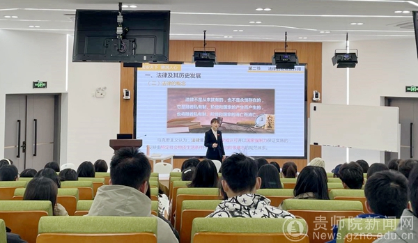 马克思主义学院杨雨莎,西南政法大学法学理论硕士。在《思想道德与法治》公开课上,她以《法安天下德润人心——做守法律讲道德的师院青年》为主题,通过“齐义继母”的故事带领同学们回顾道德的功能及作用,同时引出“法律是治国之重器,良法是善治之前提”的观点。围绕“法律的概念、法律的产生和发展、法律的作用”三个方面展开教学,以丰富的案例梳理了法律的历史发展脉络,将建立在私有制基础之上的剥削阶级类型法律与以公有制为基础的社会主义法律做对比,强调了社会主义法律的社会作用和规范作用。最后以“法律是万能的吗?”为题,引发同学们深入思考。