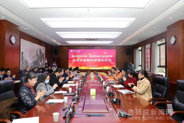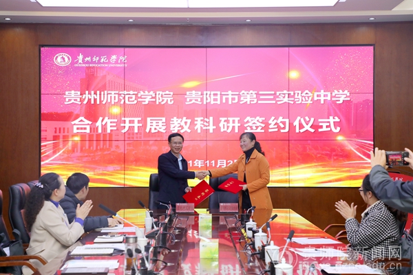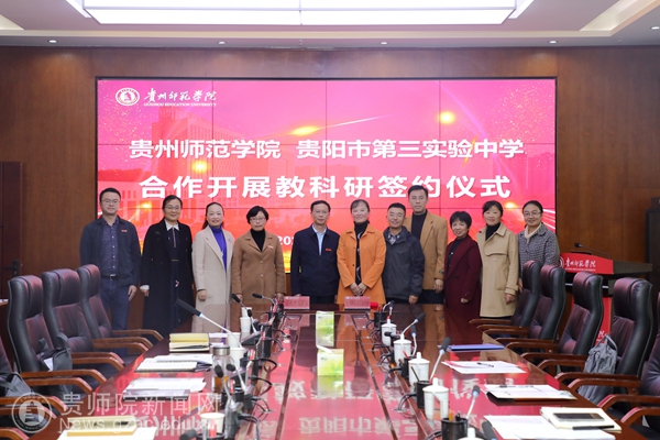 本网讯 11月2日下午,bat365中文官方网站和贵阳市第三实验中学合作开展教科研签约仪式在bat365中文官方网站信息楼二楼会议室举行。协议的签订,标志着bat365中文官方网站与贵阳市第三实验中学将发挥各自优势和特长,聚焦基础教育理论与实践研究,共同促进普通高师院校与中小学教师共同体建设,共同为贵州普通高中教育发展提升工程添砖加瓦,为贵州教育高质量发展作贡献。