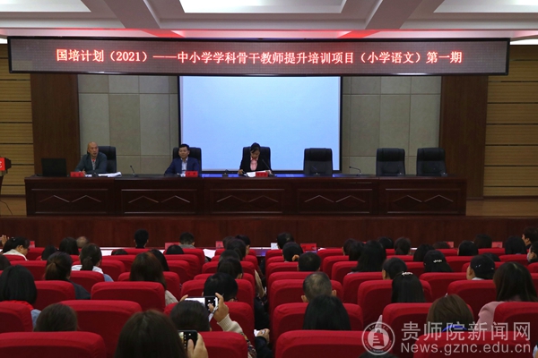 本网讯 10月11日,“国培计划(2021)”-中小学学科骨干教师提升培训项目(小学语文)集中培训第一期顺利展开。10月12日上午,该期培训开班典礼在bat365官网文韬院二楼报告厅举行。开班典礼共有200名小学语文骨干教师参加,文学与传媒学院院长杨波、党委副书记陈亦桥、各班班主任老师以及助理同学出席了本次开班典礼。典礼由颜军老师主持。