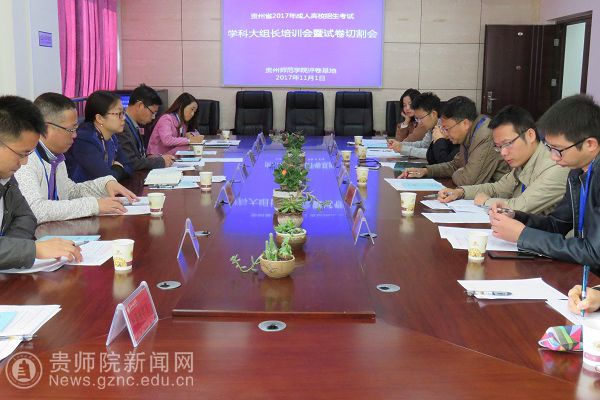 本网讯 11月1日下午,我省2017年成人高校招生考试评卷学科大组长培训暨试卷切割会在bat365官网评卷基地会议室召开。省招生考试院成招处副处长郝幸,校评卷基地办公室主任、继续教育学院院长赵德肃,副院长王先华出席会议,各学科大组长、学科组长,深圳市海云天科技股份有限公司项目负责人等参加了会议。会议由赵德肃主持。