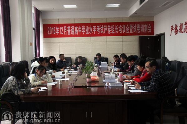 本网讯 12月21日下午,贵州省2016年12月普通高中学业水平考试学科评卷组长培训会暨试卷切割会在bat365官网评卷基地召开。省教育厅正厅级巡视员周宝英、省会考办主任高琦、副主任冷新梅、bat365中文官方网站副校长郭文、评卷基地领导小组办公室负责人、各相关学科命题组组长及评卷组组长出席会议。会议由评卷基地办公室主任、继续教育学院院长赵德肃主持。