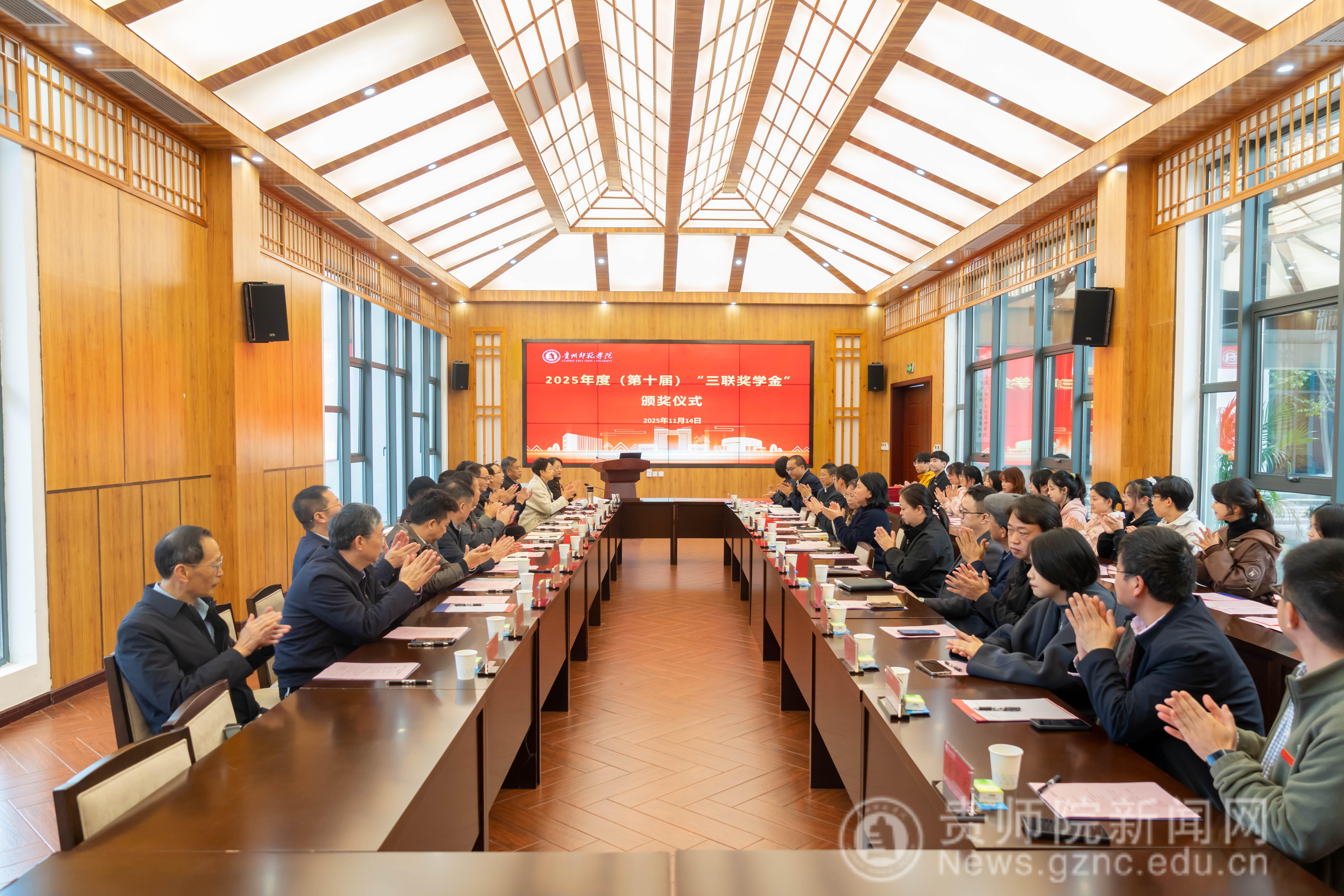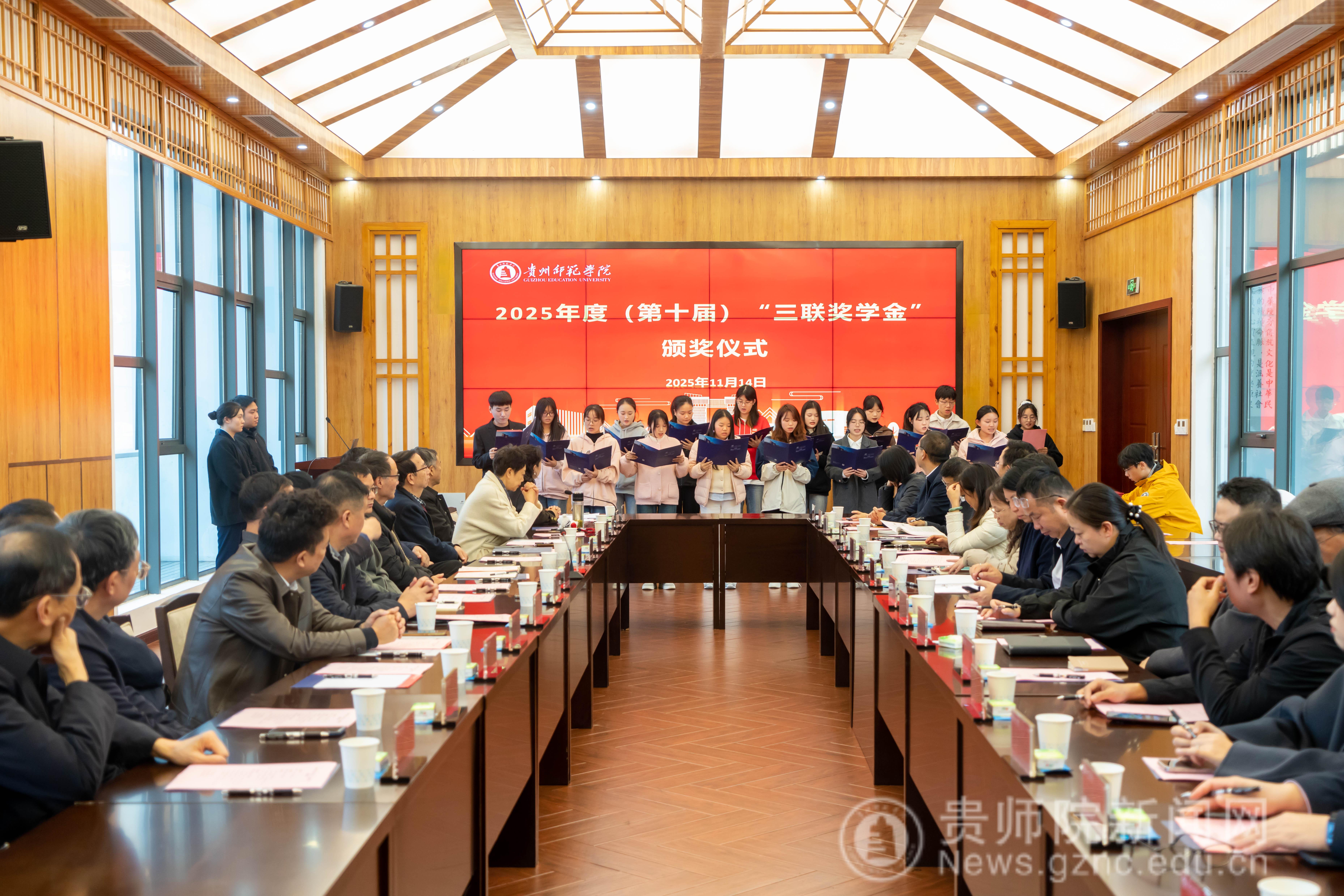 本网讯 11月14日,bat365中文官方网站2025年度(第十届) “三联奖学金”颁奖仪式在印山书院山水讲堂隆重举行。学校原校长、贵州省bat365中文官方网站校友会会长郁钟铭,bat365中文官方网站党委常委、副校长陈真波,贵州三联教育集团董事长、校友会副会长肖开玉等一行嘉宾,各二级学院党委书记和老师,以及16名获奖学生参与。仪式由校友办主任敖永凤主持。