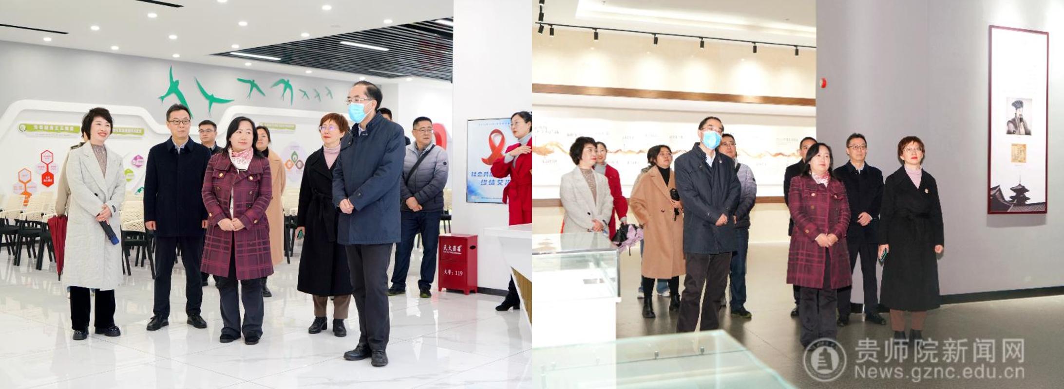 在讲座正式开始前,省总工会领导及教育工会领导和宣讲团成员在学校党委书记战勇、党委副书记高勇以及相关部门负责人的陪同下,参观了贵州省高校艾滋病防控教育基地、贵州省教育史馆及印山书院,参观过程中,领导们细致了解了学校在防艾宣传教育方面的设施建设与内容规划,认真听取了学校依托“大思政”育人平台,将健康教育融入思想政治教育和校园文化建设的具体做法及阶段性成果。省总工会毛莉副主席对学校充分用好教育基地,开展常态化、沉浸式防艾宣传的做法给予了充分肯定。她强调,艾滋病防治是健康中国建设的重要组成部分,学校是开展健康教育、培育健康观念的关键阵地,要持续创新宣传形式,提升教育的针对性和实效性。省教育工会江山主席则关切询问了学校工会组织在教职工健康关怀、教职工心理疏导与防艾教育协同方面发挥的作用,指出要进一步加强部门联动,形成教育合力。