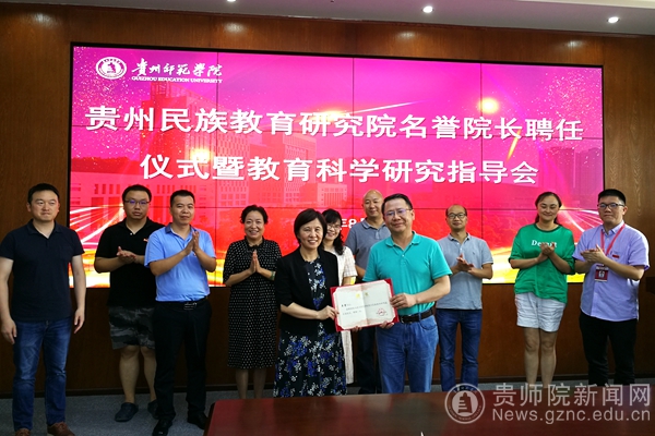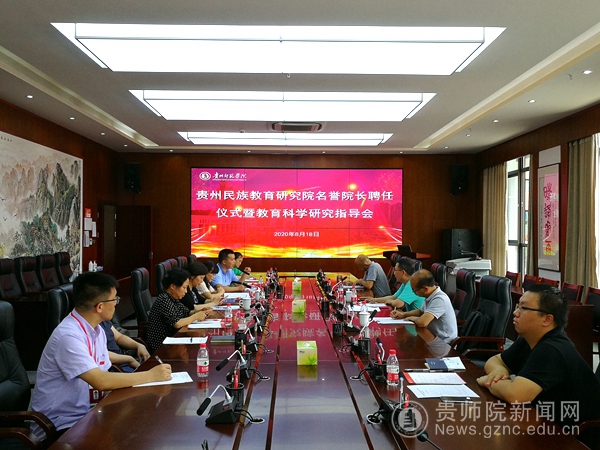 本网讯 为进一步加强学术团队建设,推进学科发展和科学研究,2020年8月18日,“贵州民族教育研究院名誉院长聘任仪式暨教育科学研究指导会”在bat365官网信息楼二楼会议室举行。中国教育科学研究院教育发展与改革研究所所长、博士生导师吴霓受聘为bat365中文官方网站贵州民族教育研究院名誉院长。校长韦维、党委副书记郭文、科研处处长王平瑞、人事处副处长王军、民教院副院长杨定玉、贵州省教育科学院高教所副教授杨立昌以及民教院部分教师代表参加会议。聘任仪式暨指导会由校党委副书记郭文主持。