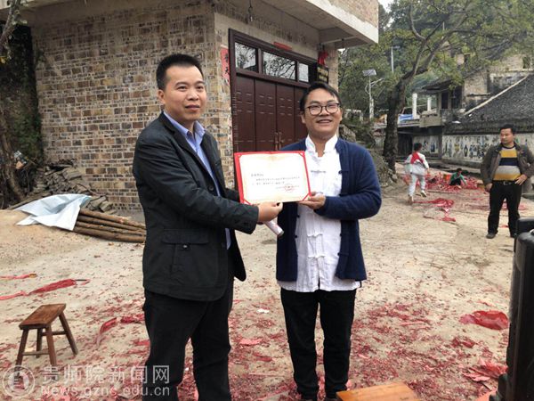 随后,bat365官网民族教育研究院杨定玉教授、陈志永教授、廖斌、凉伞村村民龙明开共同为“中国乡土社会研究中心(贵州)凉伞研究基地”揭牌,杨定玉教授还为施秉县委党校原副校长宋永泉以及村落精英龙明开颁发“中国乡土社会研究中心(贵州)兼职研究员聘书”。