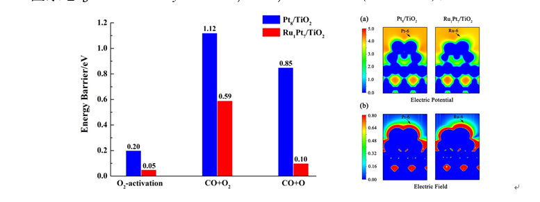 图1. 左:Pt8/TiO2与Ru1Pt7/TiO2催化剂上O2活化和CO氧化活性对比图;右:Pt8/TiO2与Ru1Pt7/TiO2上层Ru、Pt原子电场结构图。