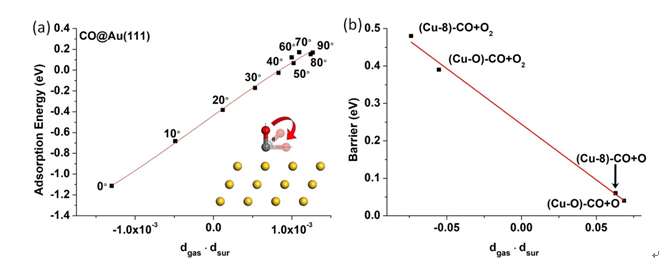 图2. (a) CO吸附能与偶极点积线性关系图;(b) Au-Cu复合催化剂表面CO氧化能垒与偶极点积线性关系图。