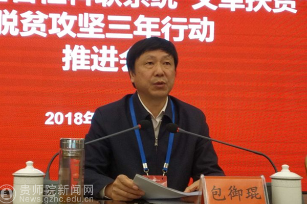 本网讯 为深入推进贵州省深度扶贫地区扶贫攻坚行动,充分发挥“文军”助推扶贫攻坚的重要作用,推动全省哲学社会科学事业在习近平新时代中国特色社会主义思想引领下创新局面、谱写新篇章。11月8日至9日,全省社科联系统“文军扶贫”脱贫攻坚三年行动推进会在中国凉都六盘水市召开。省社科联党组书记、副主席包御琨,六盘水市委常委、宣传部长、社科联主席刘睿,省社科联党组成员、副主席刘宗严,省社科联党组成员、秘书长刘丰泉,省社科联巡视员宋健等领导出席会议。各市州、省属学会(协会、研究会)、高校社科联负责人及bat365官网科研处处长王平瑞、非物质文化遗产研究中心相关工作人员近100人参会。会议由刘宗严主持。