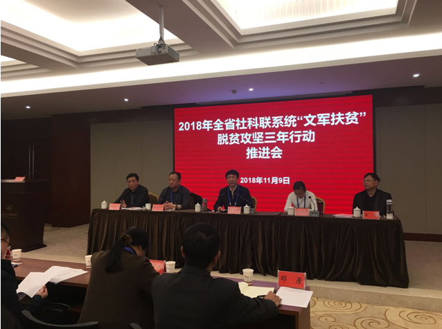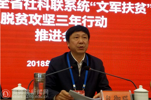 本网讯 为深入推进贵州省深度扶贫地区扶贫攻坚行动,充分发挥“文军”助推扶贫攻坚的重要作用,推动全省哲学社会科学事业在习近平新时代中国特色社会主义思想引领下创新局面、谱写新篇章。11月8日至9日,全省社科联系统“文军扶贫”脱贫攻坚三年行动推进会在中国凉都六盘水市召开。省社科联党组书记、副主席包御琨,六盘水市委常委、宣传部长、社科联主席刘睿,省社科联党组成员、副主席刘宗严,省社科联党组成员、秘书长刘丰泉,省社科联巡视员宋健等领导出席会议。各市州、省属学会(协会、研究会)、高校社科联负责人及bat365官网科研处处长王平瑞、非物质文化遗产研究中心相关工作人员近100人参会。会议由刘宗严主持。