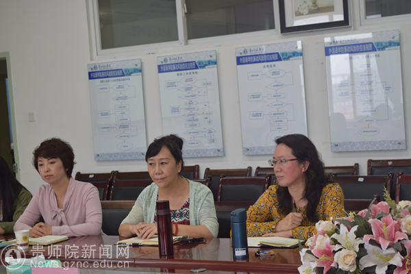 首先,余学军代表外国语学院党政及教职工对对校领导一行到我院调研指导工作表示热烈欢迎并向他们汇报了外国语学院的基本情况和工作思路。一是总体介绍学院师资队伍基本情况,外国语学院专职专任教师78人,其中硕士研究生以上学历达80%以上,副高以上职称接近50%,学历学缘结构比较合理;二是我院毕业生就业情况,通过近几年毕业生就业情况来看总体良好,毕业生当年就业率达到90%以上,传统优势专业英语教育保持就业良好势头,英语(旅游英语方向)就业前景广阔;三是学科建设及课程建设情况,外国语学院在建设一流专业、一流学科、一流课程方面积极探索,努力构建各种平台为教师提供学术发展平台。我院打破传统课程教学模式,积极构建 “1+1”教学模式,努力建设微课、慕课等课程资源,努力打造一流学科课程群,从人才培养方案的制定到课堂教学再到毕业论答辩等环节均聘请校外专家和一线专家参与,确保人才培养符合地方经济发展需要。四是产教融合。进一步加强校内外实习实训基地建设,积极探索与美国饭店协会教育学院、句酷批改网等多家单位合作,为我院学生实习实训提供了良好的环境。五是科研工作,近年来科研工作稳步推进,卓有成效,我院连续三年获批国家级课题。最后是目标绩效考核方面,外国学院充分目标绩效这根杠杆的作用,努力调动全员教职工的工作积极性,但目标绩效考核涉及教职工切身利益,工作任务繁重,实施过程更是如履薄冰,同时也希望学校层面加大宏观指导力度,以便二级学院更好的做好目标绩效考核工作。