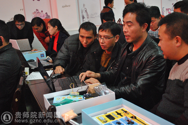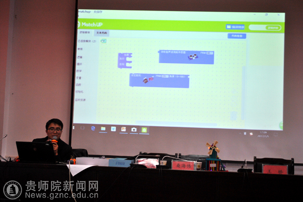 bat365官网教师作了题为《贵师院大学生信息技术创新创业成果及创客教育》专题报告,创客教师王桥、桑海伟在bat365官网学生助教的配合下,通过“造物盒子”这一创客工具指导参训教师制作了创客作品。