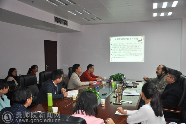 本网讯 受贵州旅游研究院邀请,11月21日山东大学中国乡土社会研究中心主任、博士生导师张士闪教授做客贵州旅游研究院第九届山地旅游学术研讨会,在bat365官网信息楼802会议室作了题为《礼俗互动与中国乡村传统》的学术报告。本次研讨会由贵州民族学与人类学高等研究院承办,校长助理徐凤增主持了研讨会。贵州民族学与人类学高等研究院、地理与旅游学院、传媒与设计学院以及历史与社会学院等单位部分师生参加了学术报告会。
